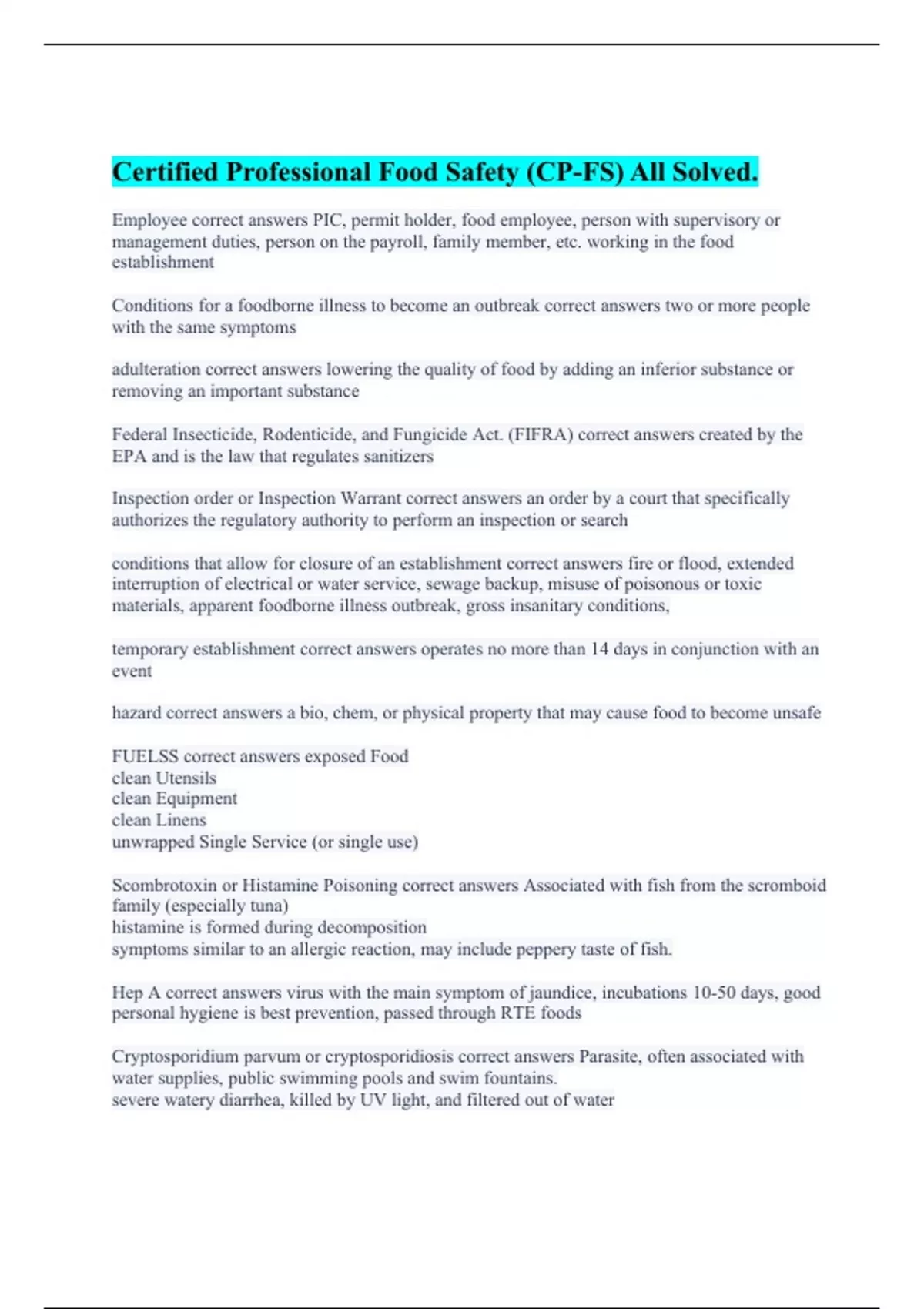 NEHA CP-FS (100% Correct Answers) Certified Professional Food Safety (CP-FS) All Solved. Certified Professional Food Safety (CP-FS) Practice Test 7,8,10 (All Errorless Answers Offered) Certified Professional Food Safety (CP-FS) Exam (with Complete Solutions) Certified Professional - Food Safety Complete Review (NEHA 3rd Edition 2023) A+ Guaranteed.