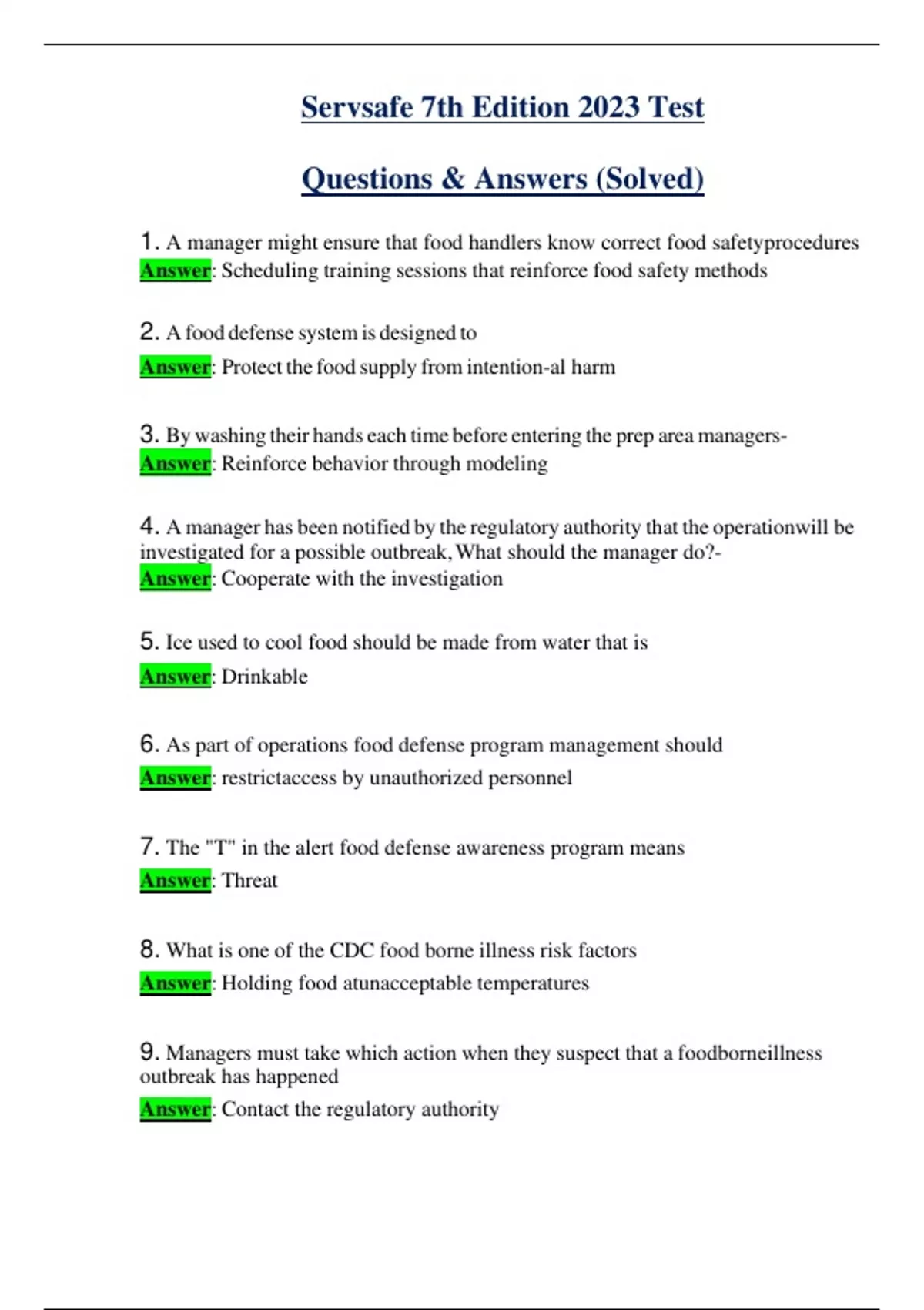 2024 Servsafe Manager 7th Edition Tests Set ( Test 1, 2 ) Questions & Answers (Solved)