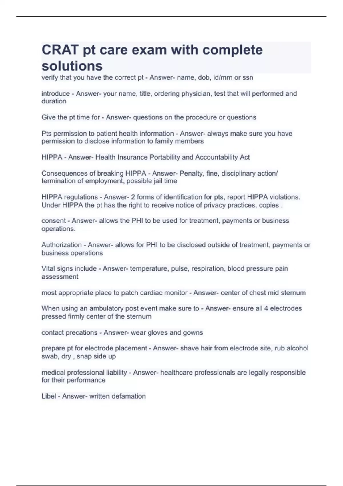 CRAT pt care exam with complete solutions CRAT TEST PREP (Anatomy) Exam with correct Answers 2023 CRAT*16* Exam Questions and Answers 2023 CCI CRAT Exam with complete solutions CRAT - CCI 2023 Exam Questions with Verified Answers CCI CRAT Exam Practice Test 2-solved CRAT Practice Test Questions and Answers AEA Certification Exam Questions with corr