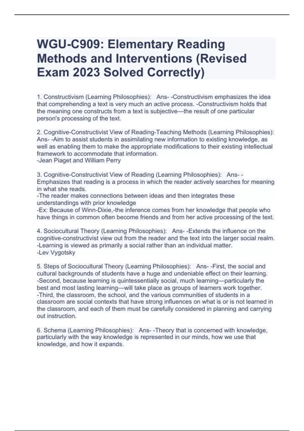 WGU-C909: Elementary Reading Methods and Interventions Study Guide with complete solution WGU C909 Pre-Assessment Questions and Answers 2023 Graded A C909 - Elementary Reading Methods and Interventions (Practice Test Questions and Answers 2023 Graded A) WGU-C909: Elementary Reading Methods and Interventions (Revised Exam 2023 Solved Correctly)