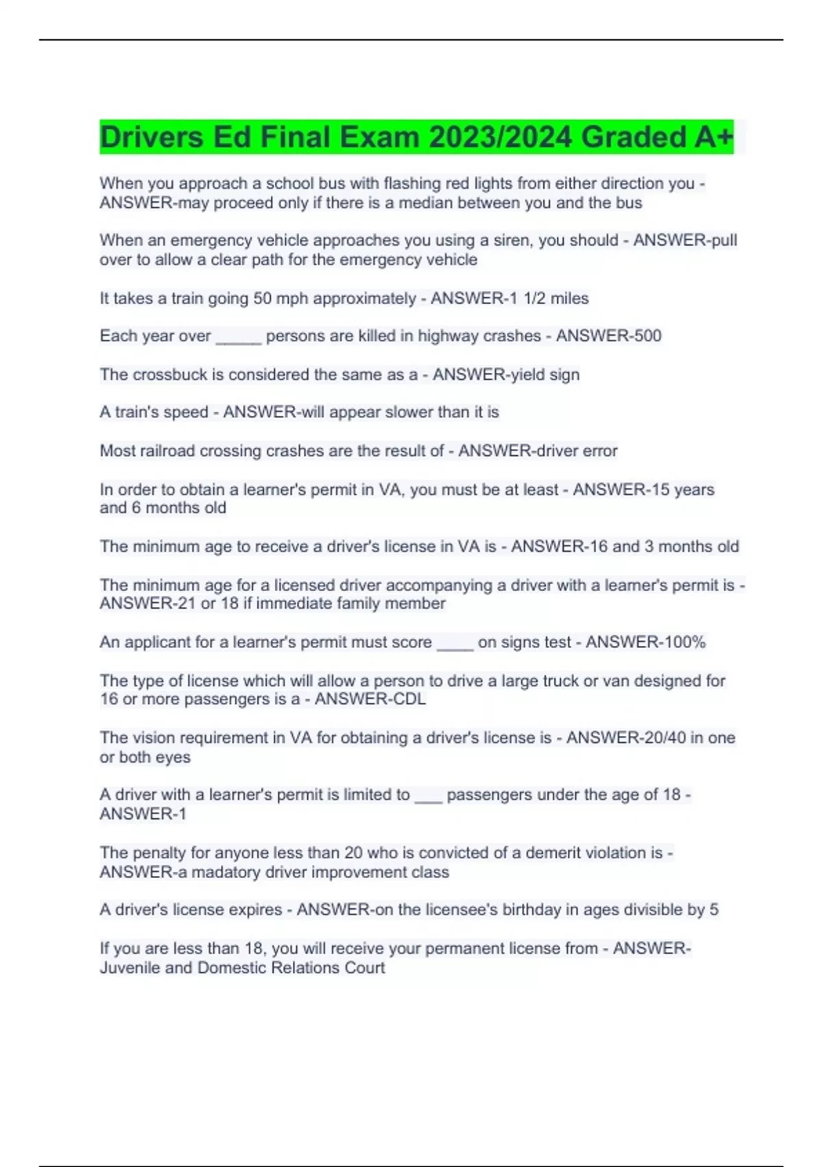 Drivers Ed Final Exam 2023/2024 Graded A+ CALIFORNIA SCHOOL BUS DRIVER STUDY GUIDE CHP TEST 1 WITH COMPLETE SOLUTIONS American School Bus Exam 2022/2023 with Complete Solutions American School Bus Driver (Actual) Exam 2023/2024 Solved 100% Correct AMERICAN CHP PRACTICE QUIZ #2 GRADED A+ State Truck Driving Championship sample questions and Answers