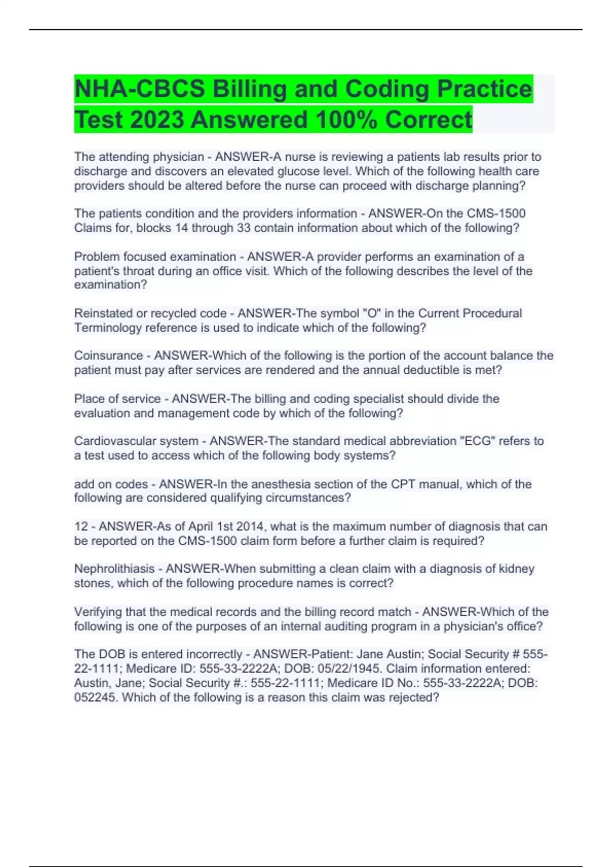 NHA-CBCS Billing and Coding Practice Test 2023 Answered 100% Correct NHA -CBCS- Certified Billing and Coding Specialist Study Guide with Complete Solutions NHA CBCS Exam Questions and Answers 2023/2024 100% Solved NHA CBCS Sample Questions and Answers 100% Correct NHA CBCS Certification Study Guide with Complete Solutions