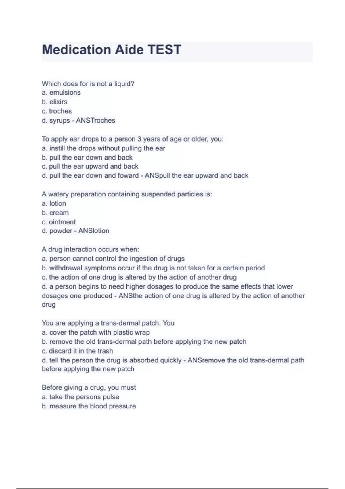 ATI 2019 Fundamentals Proctored Exam final (2022/2023) (Verified Answers) NC Medication Aide (Med Tech) Exam (2022/2023) (Verified Answers) Certified Medication Aide Review (2022/2023) (Verified Answers) Nebraska State Medication Aide Exam PRACTICE (2022/2023) (Verified Answers) Med Aide quizzes and tests from all units (2022/2023) (Verified Ans