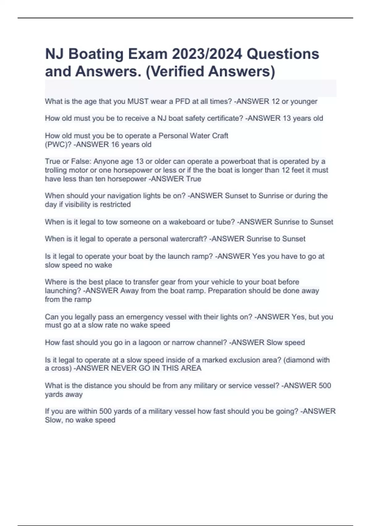 NJ Boating Exam 2023/2024 Questions and Answers. (Verified Answers)