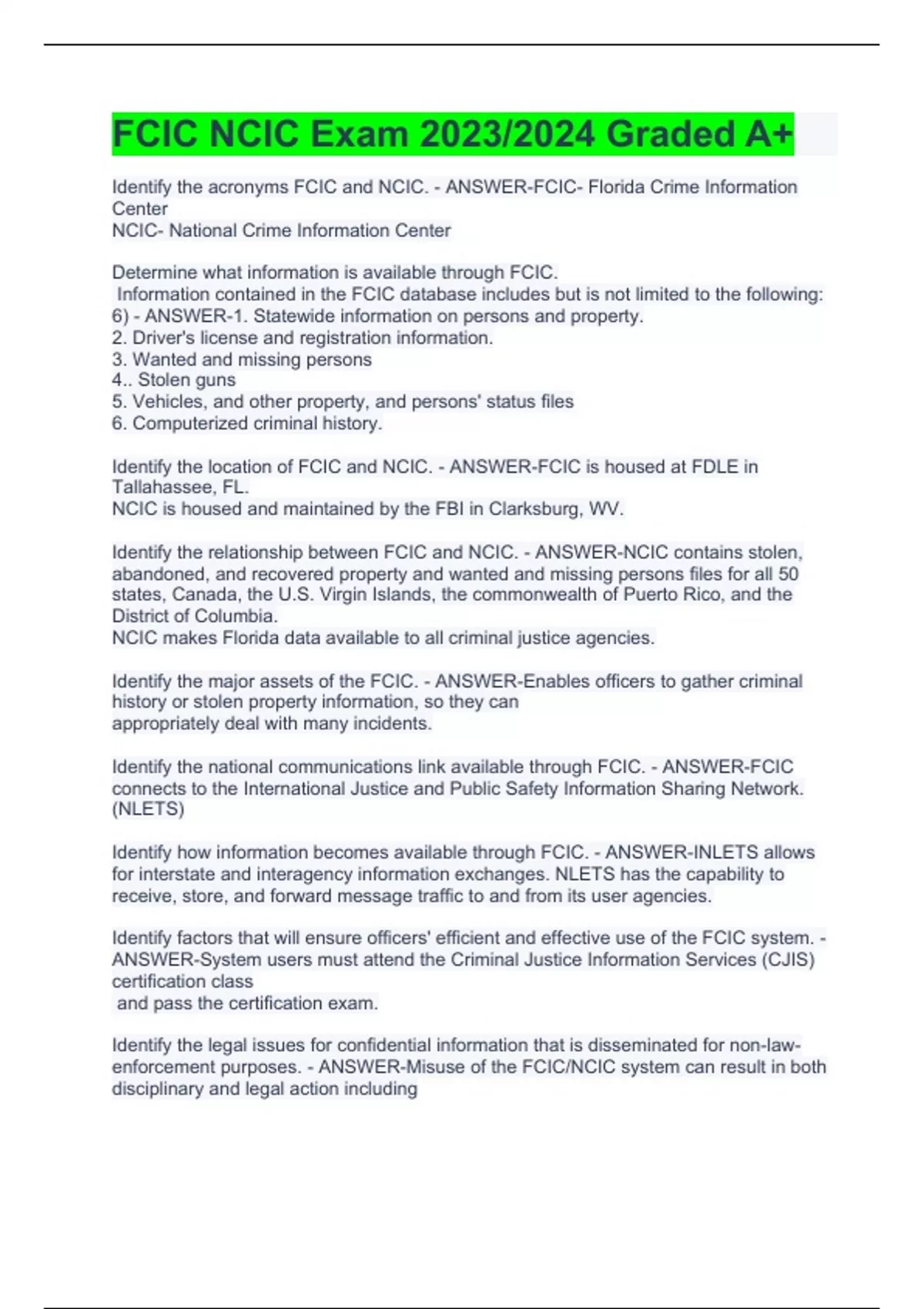 FCIC/NCIC practice exam 2023/2024 FCIC NCIC Exam 2023/2024 Graded A+ FCIC/NCIC Questions and Answers 100% Correct NCIC Study Guide with Complete Solutions 2023 FCIC/NCIC TERMS AND DEFINITIONS 100% CORRECT NCIC Exam 9- Solved NCIC/TCIC Questions Answered 100% NCIC QUERY CERTIFICATION STUDY QUESTIONS AND ANSWERS 100%