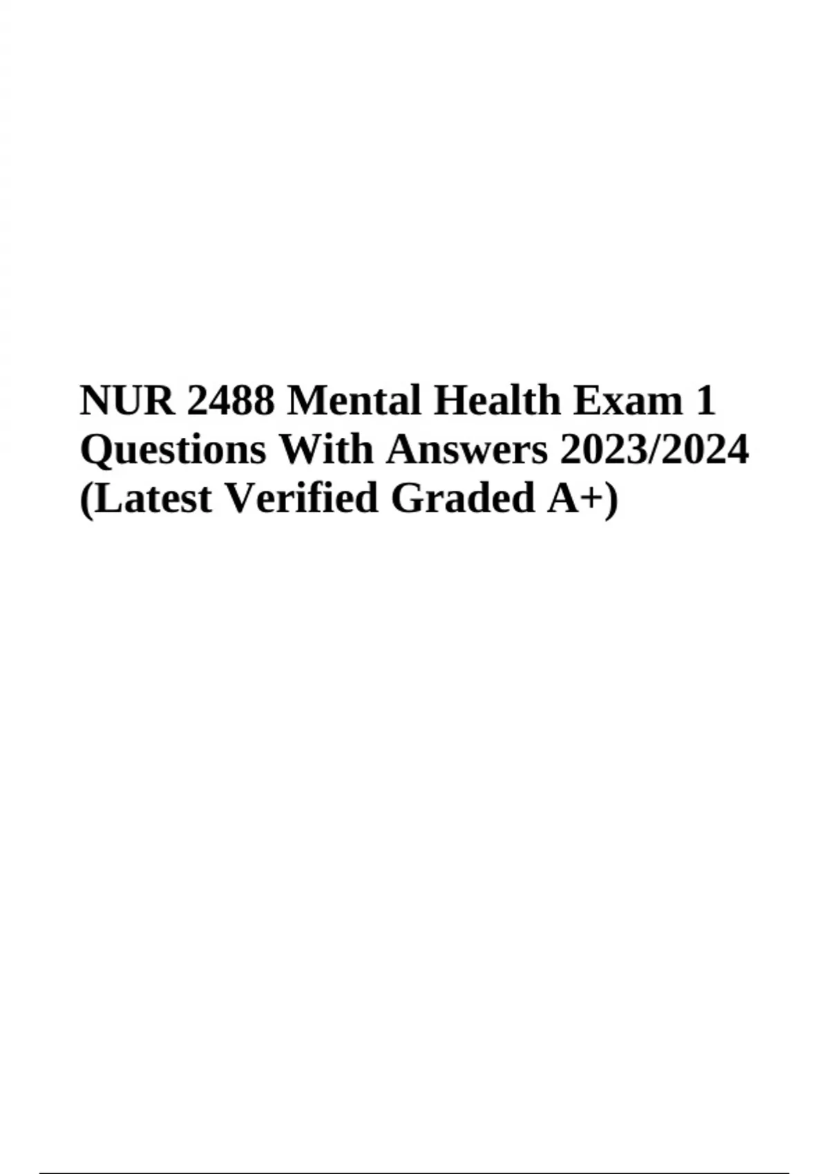 NUR 2488 Mental Health Nursing | Exam 2 Questions With Answers | Latest 2023/2024 Graded A+, NUR 2488 Mental Health Final Exam 1, NUR 2488 Final Exam Questions With Verified Answers AND NUR 2488 FINAL EXAM QUESTIONS WITH ANSWERS 2023/2024 | LATEST VERIFIED GRADED A+