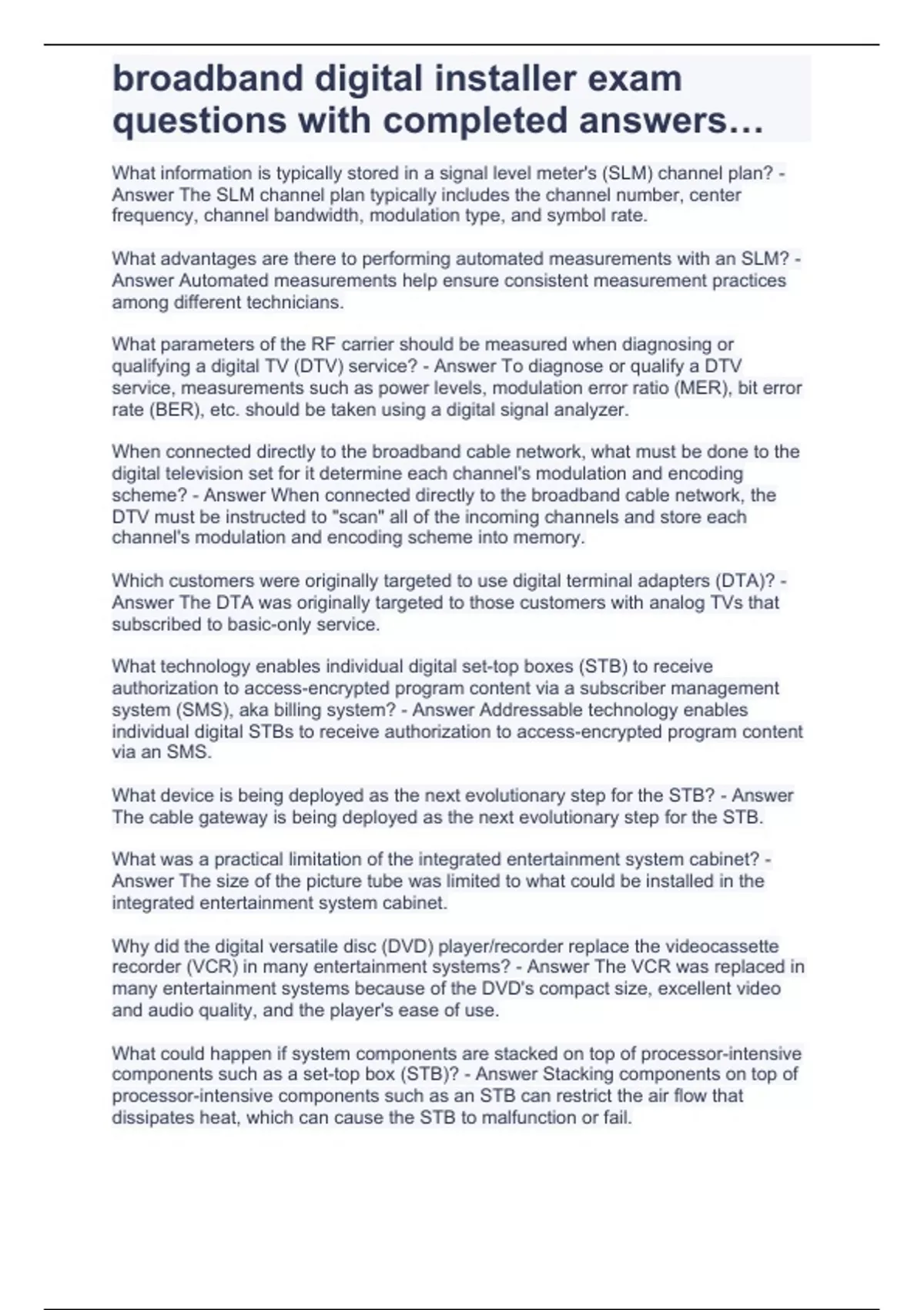 broadband digital installer exam questions with completed answers…,Broadband Digital Installer Exam (NCTI) Questions With Solved Answers..,Broadband Premises Troubleshooting 1,NCTI BDI (Final Review) Q & A Rated 100% Correct!!,33403 Broadband Systems (Concept Checks & Review Questions) Answered!!
