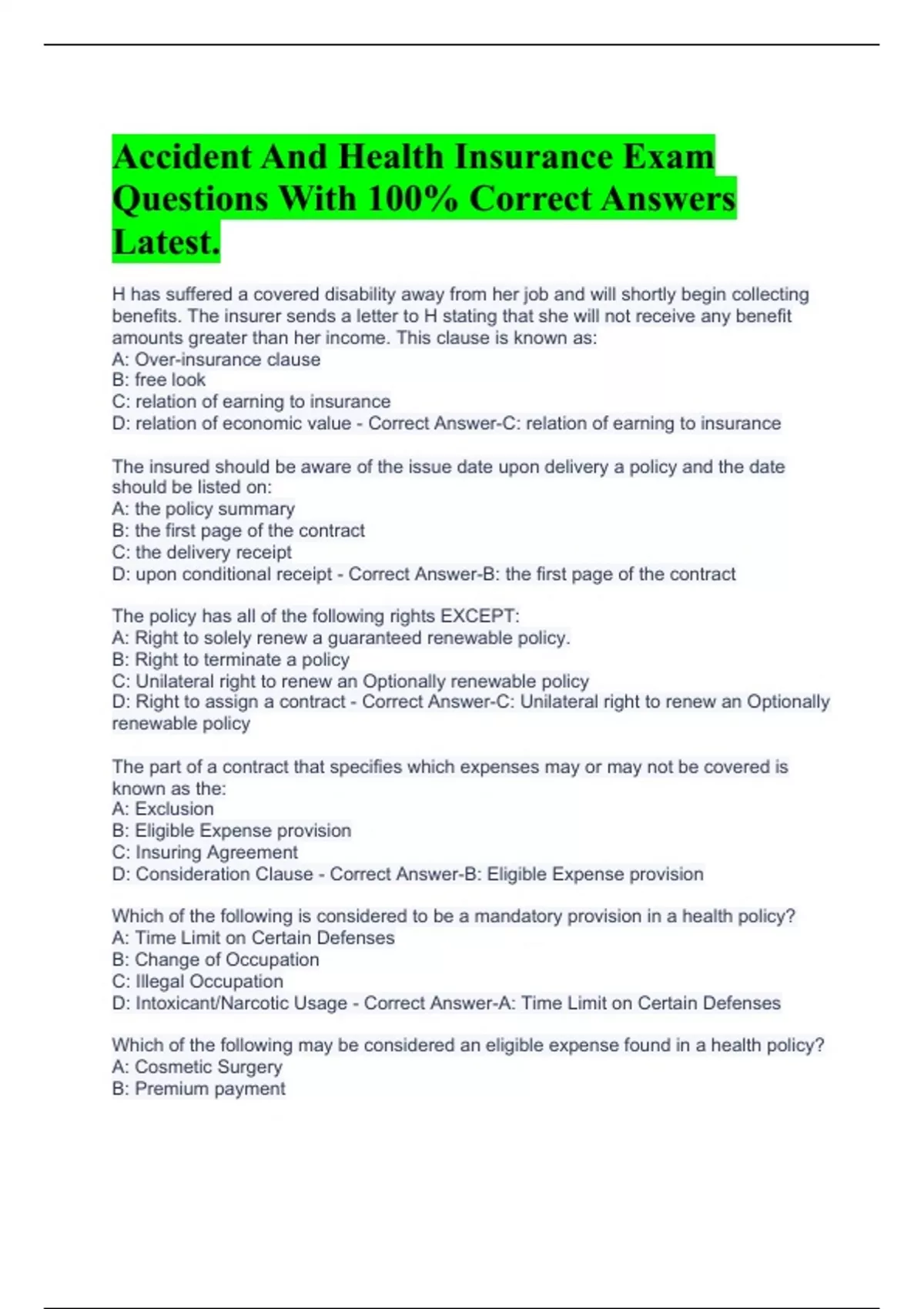 Accident And Health Insurance Exam Questions With 100% Correct Answers Latest.