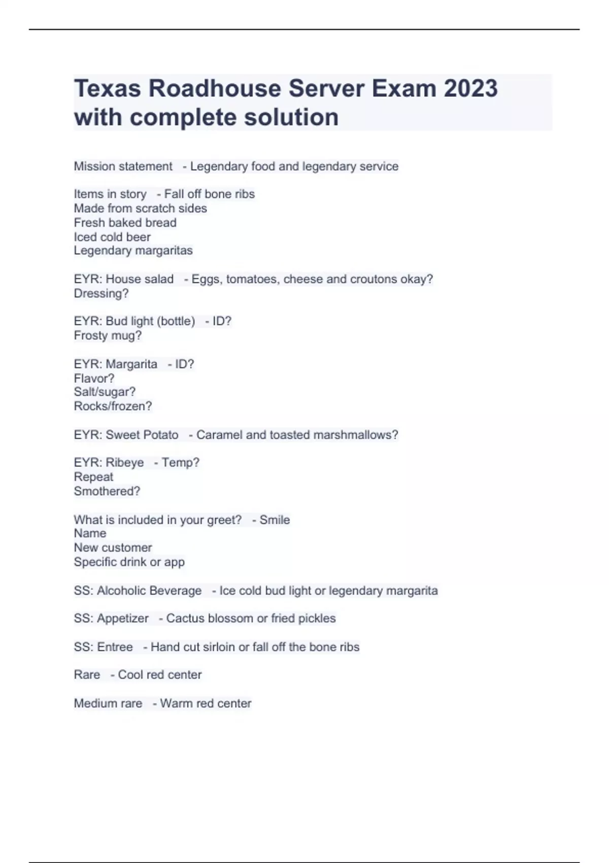 Texas Roadhouse Server Exam 2023 with complete solution Texas Roadhouse Server Training Questions and Answers with complete solution Texas Roadhouse Menu Test 2023 with complete solution Server Test TXRH Questions and Answers 2023 Graded A+ Texas Roadhouse Server Training Questions and Answers with complete solution
