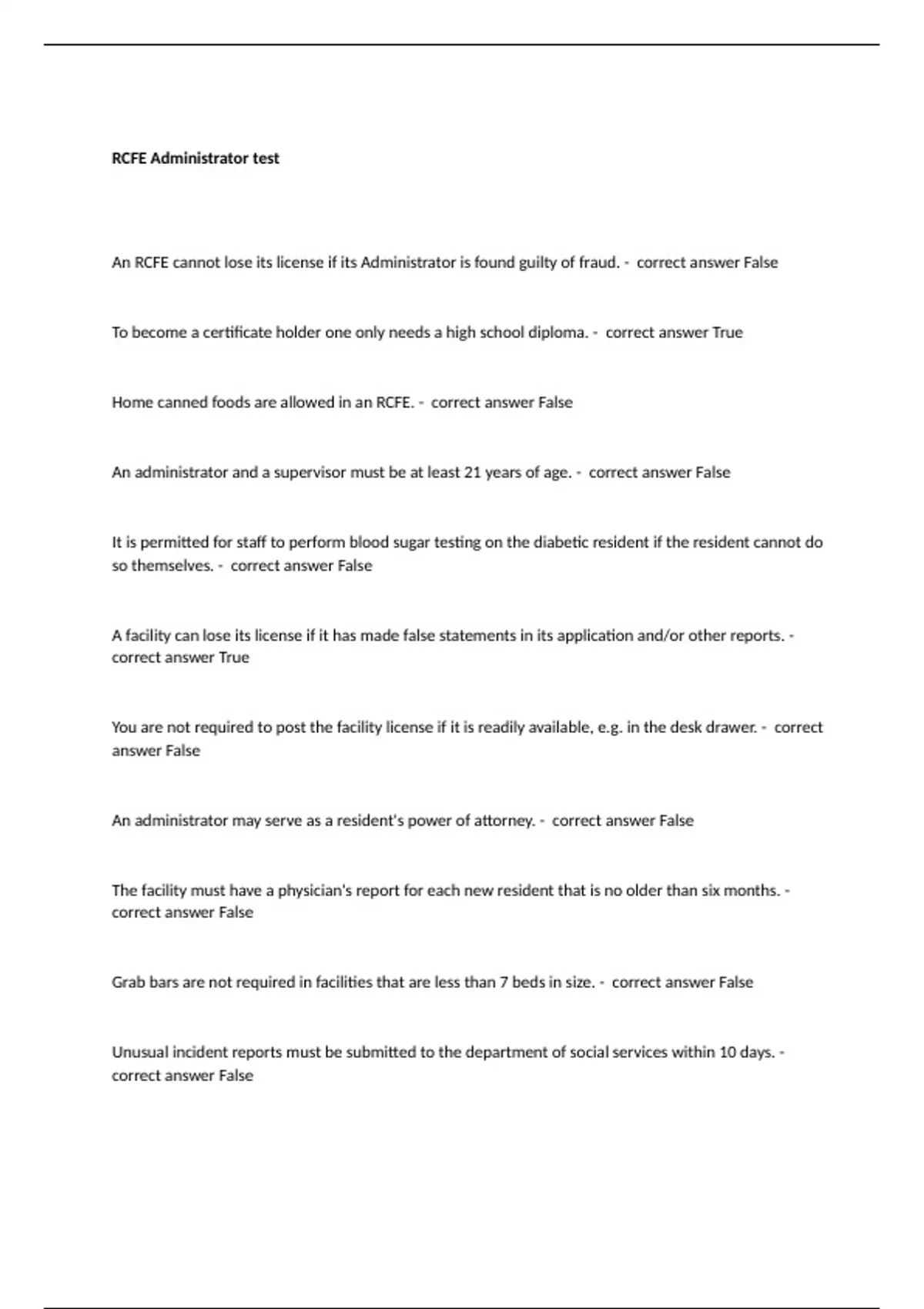 RCFE Test Preparation questions and complete correct answers RCFE Initial Certification Test questions and 100% correct answers