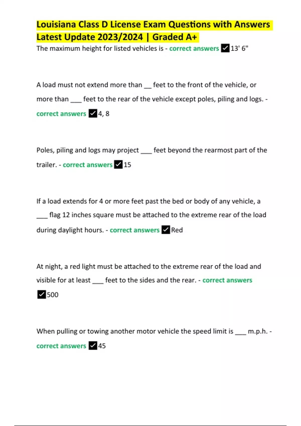 Louisiana Class D "Chauffeur's" License Exam Questions With Answers | Latest Update 2023 /2024 (Graded A+), Louisiana Class D "Chauffeur's" License Exam Solutions, Louisiana Class D License Exam, Louisiana Class D "Chauffeur's" License Test, Louisiana Class D License Final Exam Questions with Answers and Louisiana Class D "Chauffeur's" License Test
