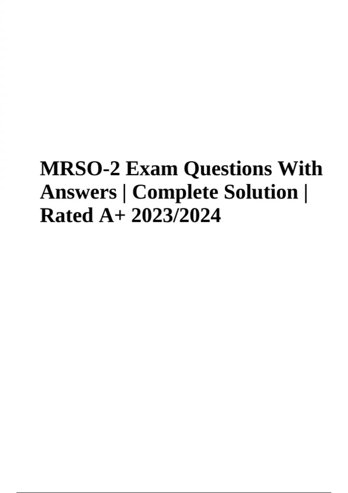 MRSO Exam Prep Questions With Answers Latest 2023/2024 Graded A+, MRSO EXAM PRACTICE QUESTIONS With Verified ANSWERS, MRSO Exam Prep Questions With Answers Complete Solution | Rated 100% 2023/2024 and MRSO FINAL EXAM WITH QUESTIONS AND ANSWERS | LATEST AN
