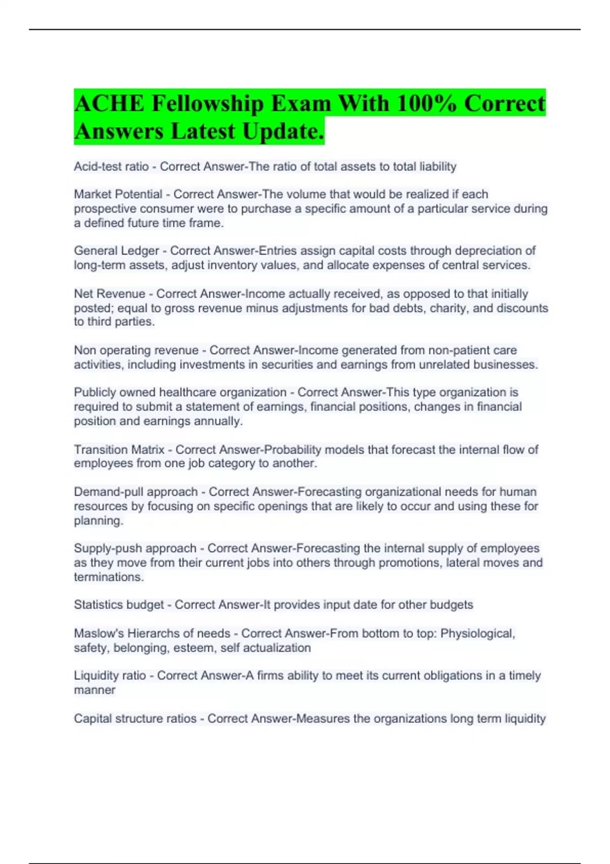 FACHE BOG Exam - All Topics With Questions With Complete Solution 2023 ACHE - BOG Exam - Additional Sample Questions With 100% Correct Answers Latest Update. FACHE Exam With 100% Correct Answers 2023 ACHE FACHE BOG HEALTHCARE IT AND IM EXAM WITH 100% CORRECT ANSWERS 2023 ACHE FACHE BOG MANAGEMENT EXAM WITH 100% CORRECT ANSWERS 2023