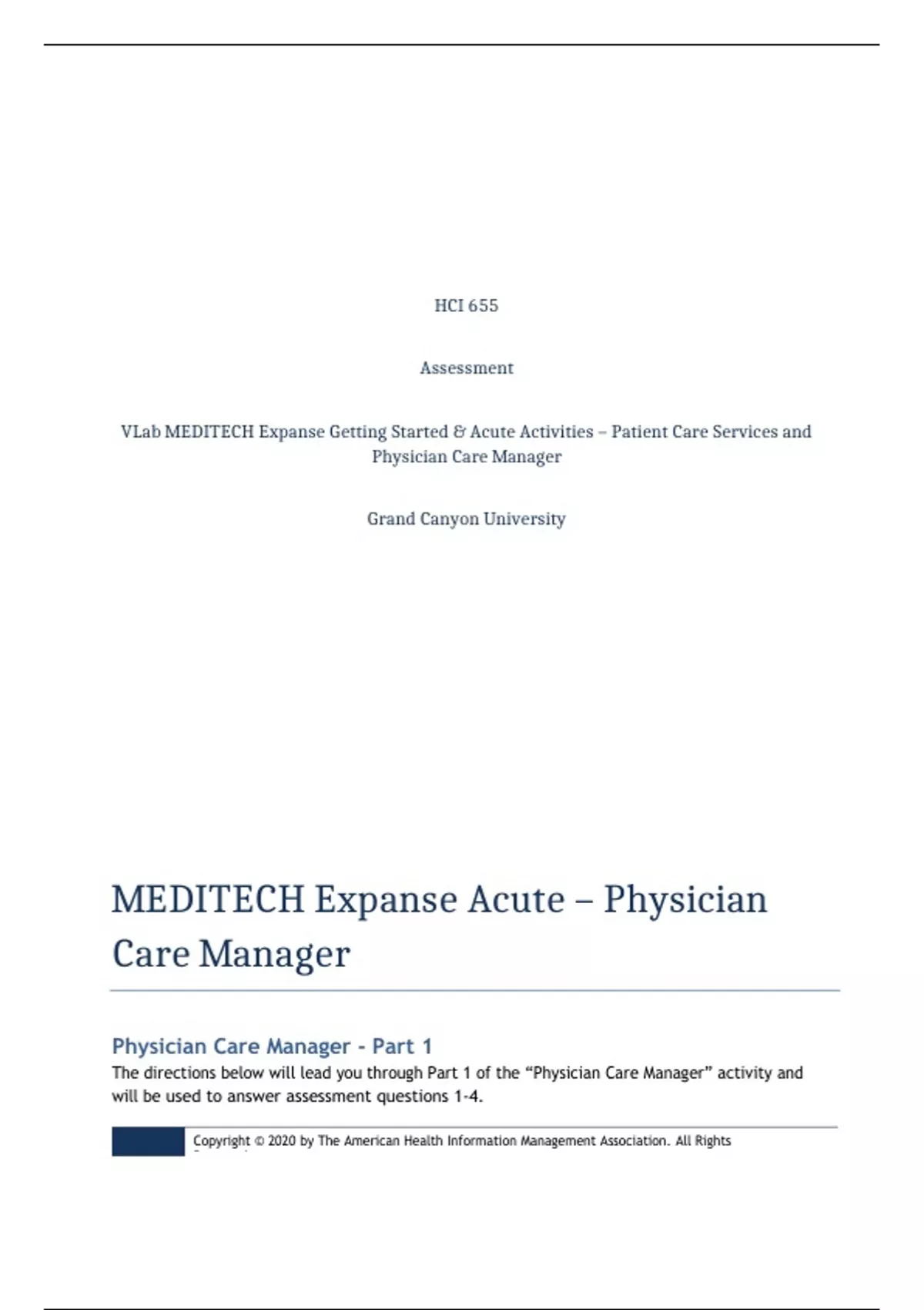 - HCI 655 Topic 1 Assignment: VLab MEDITECH Expanse Getting Started & Acute Activities (Patient Care Services and Physician Care Manager) - HCI 655 Topic 1 Assignment: Exploring EHRs - HCI 655 Topic 2 Assessment: VLab - MEDITECH Expanse - Acute Activities (Deficiency Analysis and Deficiency Reporting) .......... (CONTINUED)