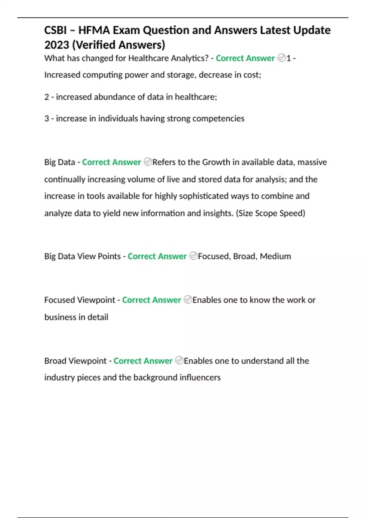 CSBI – HFMA Exam Question and Answers Latest Update 2023 (Verified Answers) 2 Exam (elaborations) Certified Specialist Business Intelligence Exam Questions and Answers (Latest Update 2023) 3 Exam (elaborations) CSPR - Certified Specialist Payment Rep (HFMA) Latest Update 2023