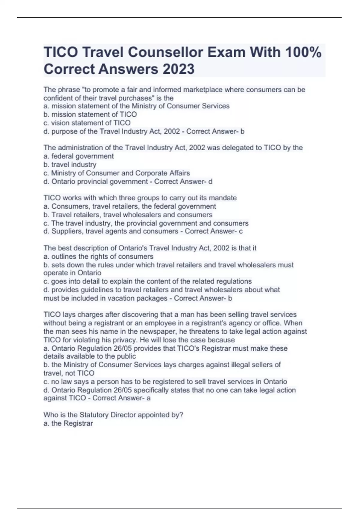 TICO REVIEW QEESTIONS WITH 100% CORRECT ANSWERS 2023 TICO TEST SAMPLE QUESTIONS WIT 100% CORRECT ANSWER 2023 TICO Practice Questions With Correct Answers 2023 TICO Travel Counsellor Exam With 100% Correct Answers 2023 Module 1 for TICO Questions With Correct Solutions 2023/2024