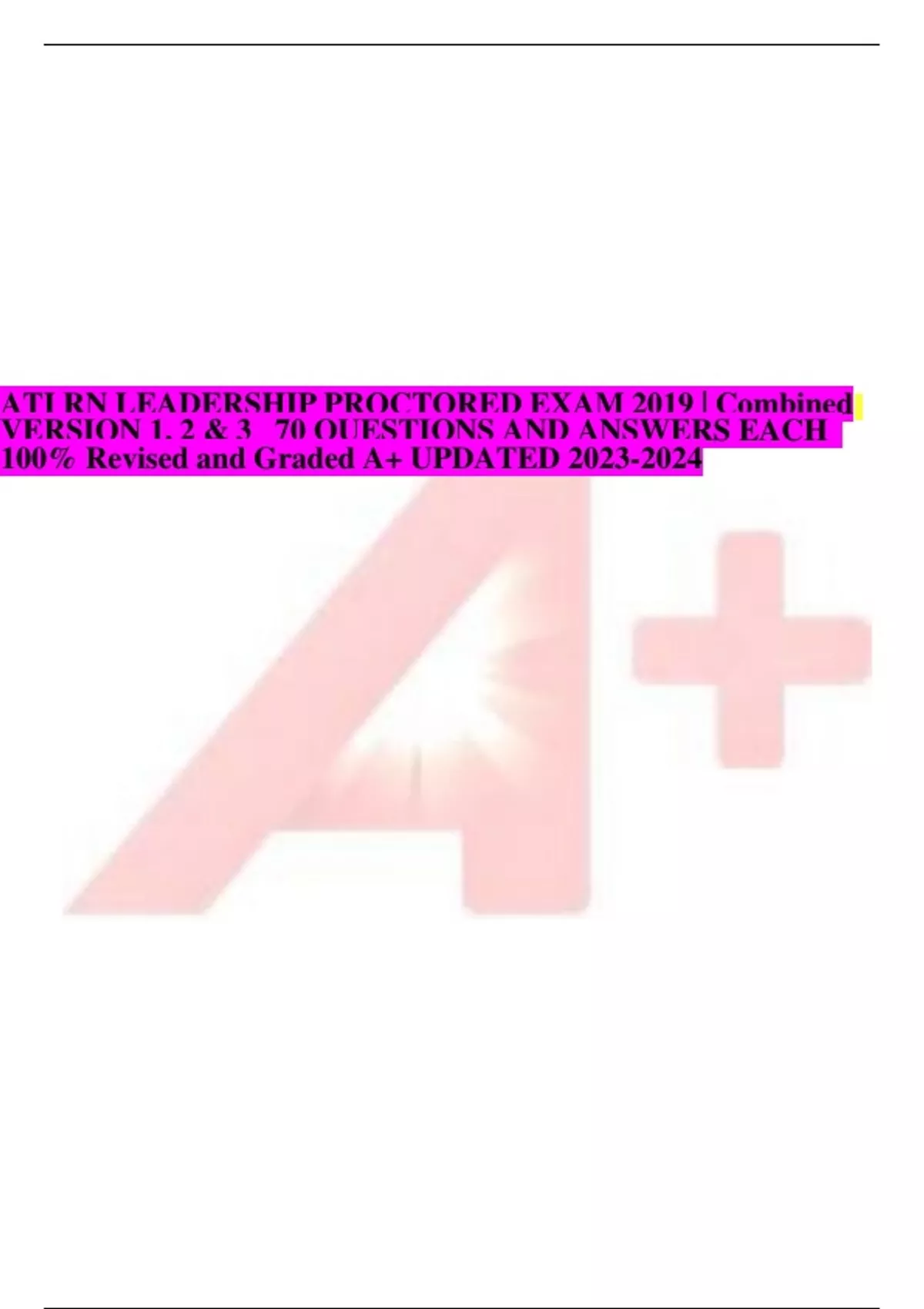 ATI RN LEADERSHIP PROCTORED EXAM 2019 LATEST UPDATED ATI RN LEADERSHIP PROCTORED EXAM VERSION 3 LATEST WITH CORRECT QUESTIONS AND VERIFIED ANSWERS ATI RN LEADERSHIP PROCTORED EXAM 2019 | Combined VERSION 1, 2 & 3 70 QUESTIONS AND ANSWERS EACH 100% Revised and Graded A+ UPDATED
