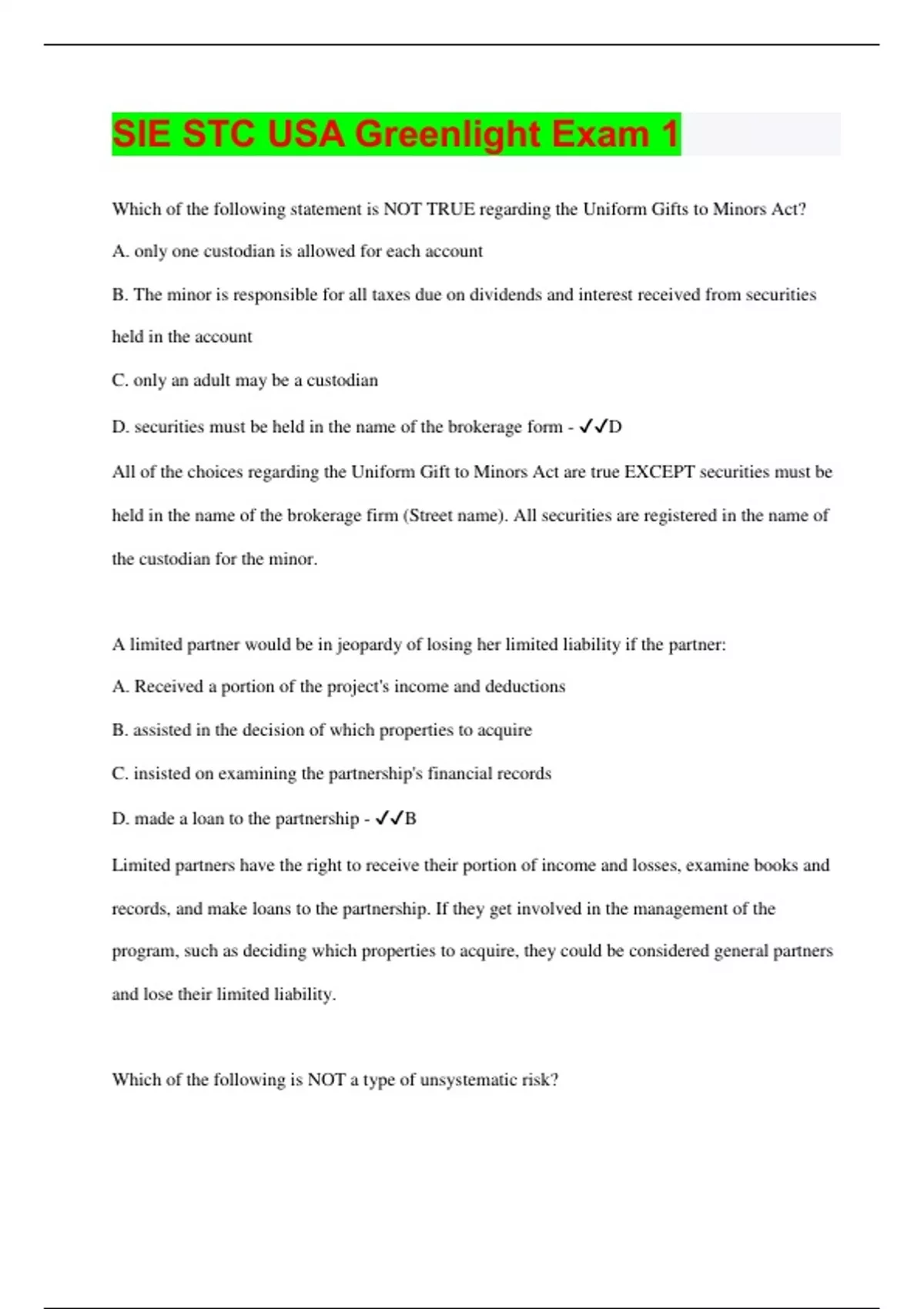 SIE STC USA Greenlight Exam 1 | Questions with 100% Correct Answers | Updated and Verified | 41 Pages