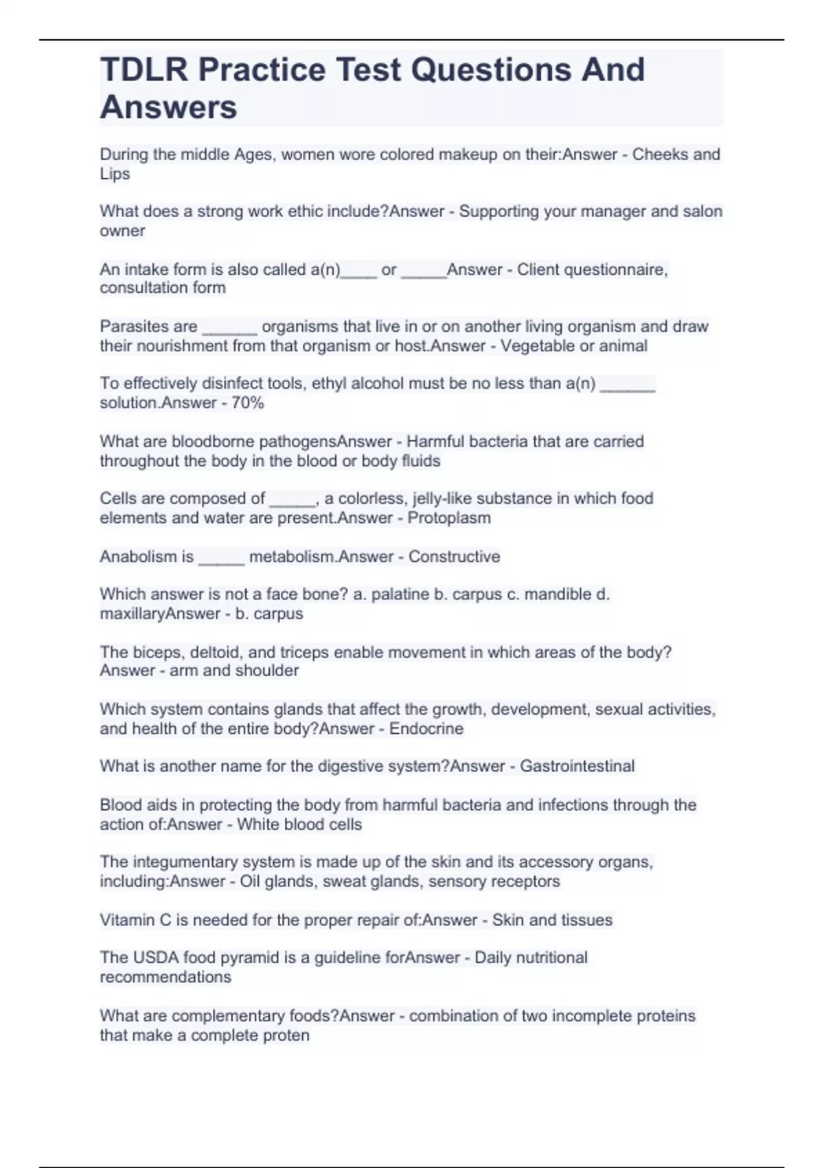 TDLR Practice Test Questions And Answers,TDLR Exam Verified 100% Correct!!,TDLR Written Exam Solved Correctly 100%,2023 Tdlr written exam psi review questions and answers rated 100% correct!!,TDLR Cosmetology Rules and Regulations Practice Test Questions And Answers…,2023 TDLR Lash Extension Written Exam Already Passed!!,TDLR Cosmetology Written St