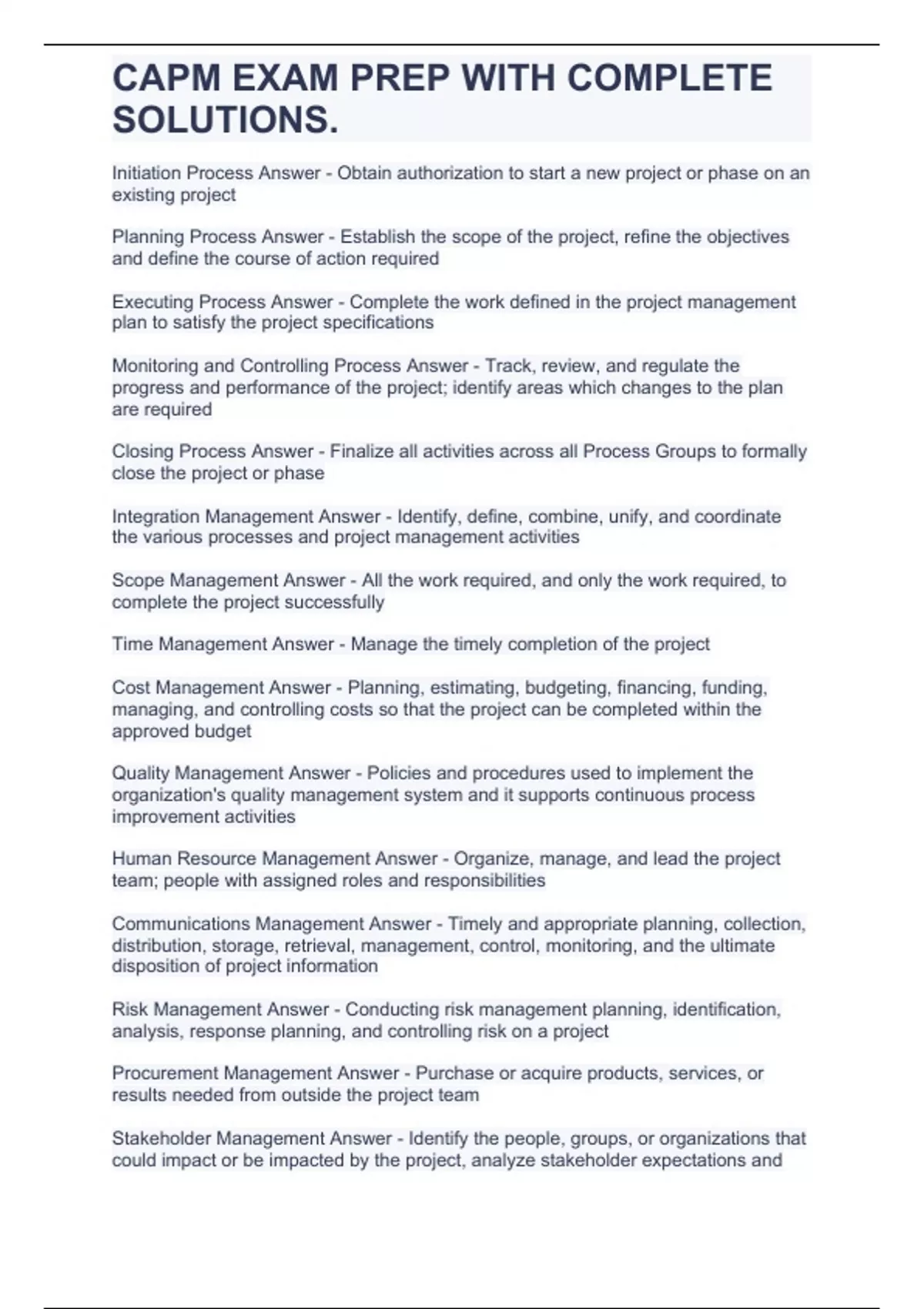 CAPM EXAM PREP WITH COMPLETE SOLUTIONS.,Certified Associate in Project Management (CAPM),CAPM Exam study guide with correct answers.,CAPM Practice Test 150 Questions And Answers.,CAPM Exam,CAPM-EXAM TERMS,CAPM Exam Prep Verified 100% Correct!!