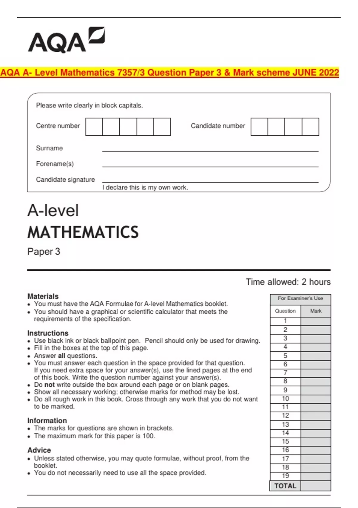 AQA A- Level Mathematics 7357/3 Question Paper 3 & Mark scheme JUNE 2022