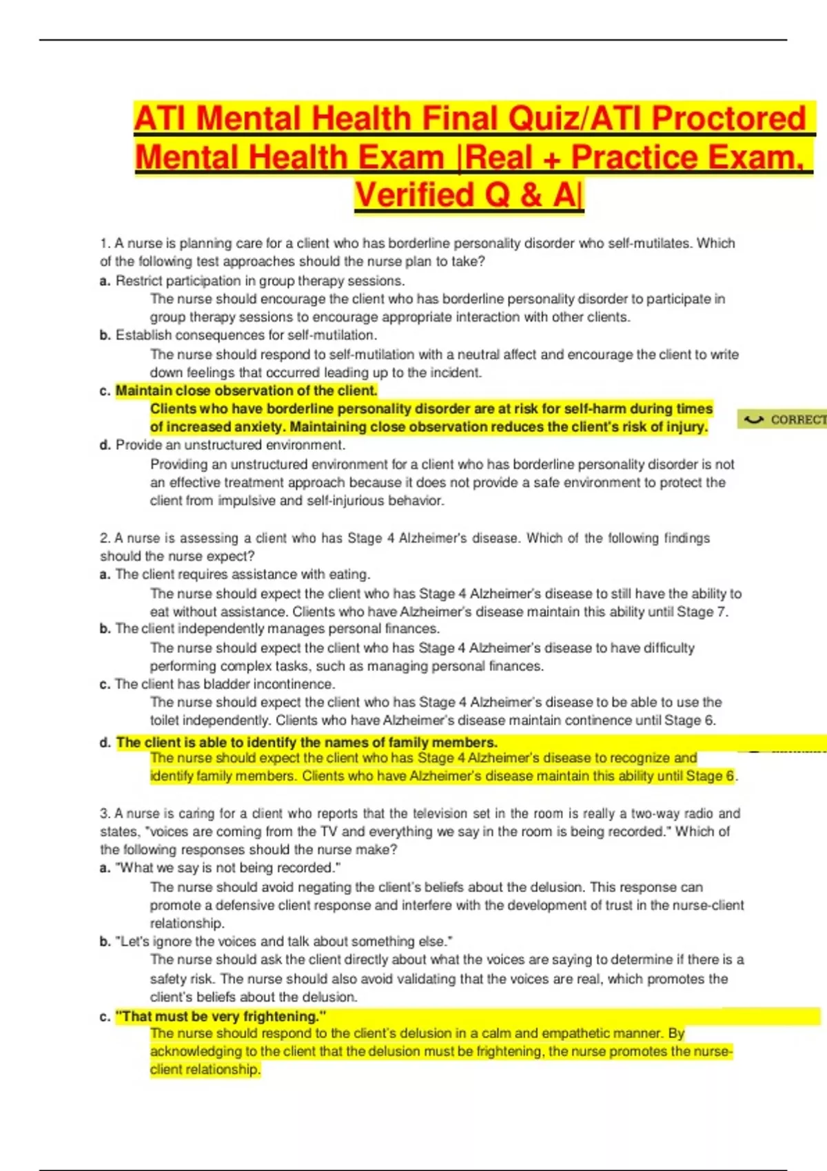 1 Exam (elaborations) 2023 ATI MENTAL HEALTH A 2023 PROCTORED EXAM(UPDATED 2023 STUDY GUIE) 2 Exam (elaborations) 2023 NGN ATI MENTAL HEALTH PROCTORED RETAKE EXAM 3 Exam (elaborations) ATI Mental Health Proctored A,B& C 2019(3 Versions) 4 Exam (elaborations) ATI MENTAL HEALTH C ALL 70 QUESTIONS AND ANSWERS 5 Exam (elaborations) ATI Mental Healt