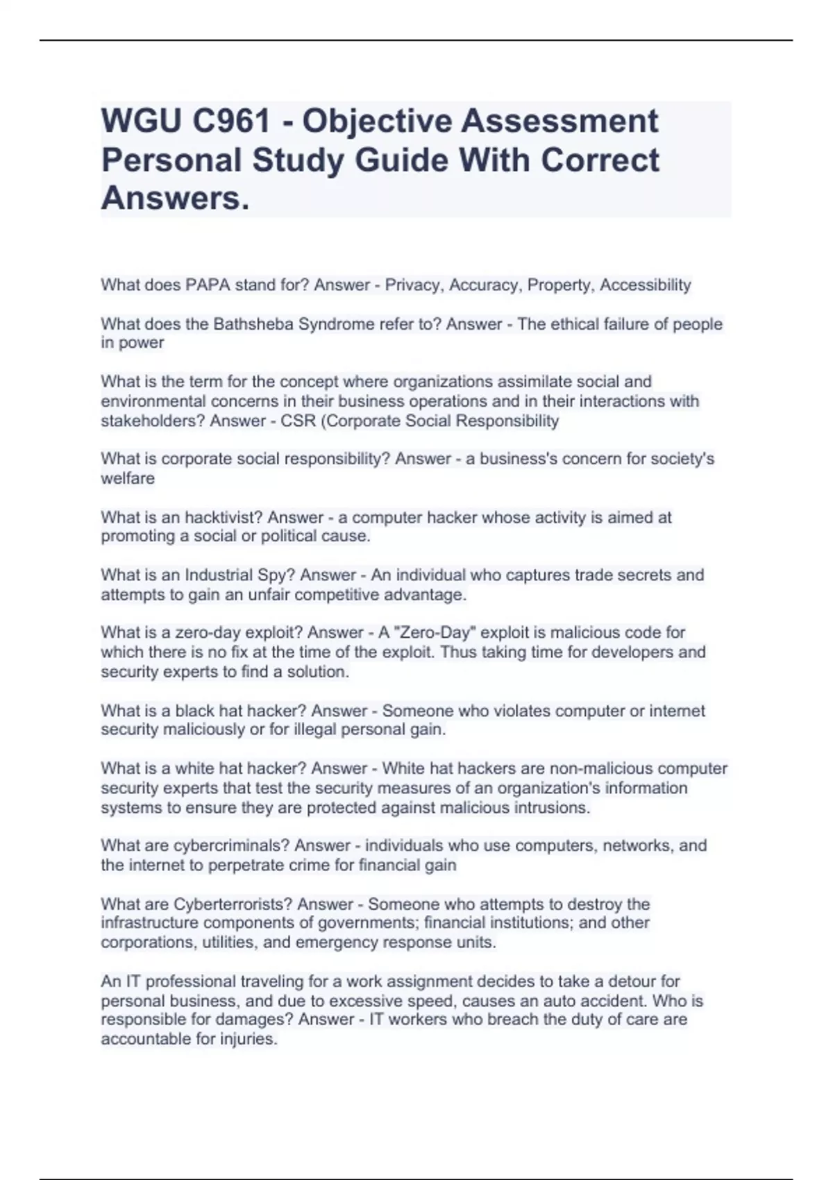 WGU C961 - Objective Assessment Personal Study Guide With Correct Answers.,WGU C961 Review Rated 100% Correct.,WGU Ethics in Technology - C961: Pre-assessment (fixed) Questions With 100% Correct Answers.,WGU C961 Ethics In Technology Glossary Terms,WGU C961 - Ethics in Technology Exam Verified 100% Correct.,WGU Ethics in Technology - C961: Pre-ass