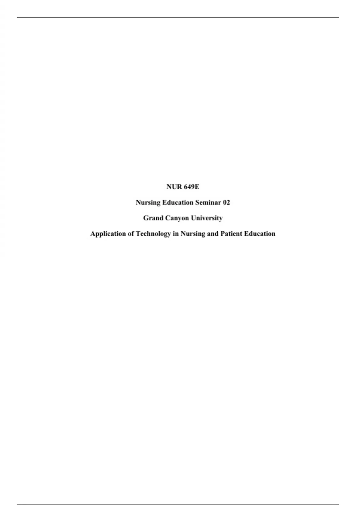 - NUR 649E Topic 3 Assignment: Application of Technology in Nursing and Patient Education - NUR 649E Topic 5 Assignment: Distance Education Learning - NUR 649E Topic 7 Assignment: Personal Class Design Project Part 2 - NUR 649E Topic 8 Assignment: CLC - Critical Thinking Strategies Case Study