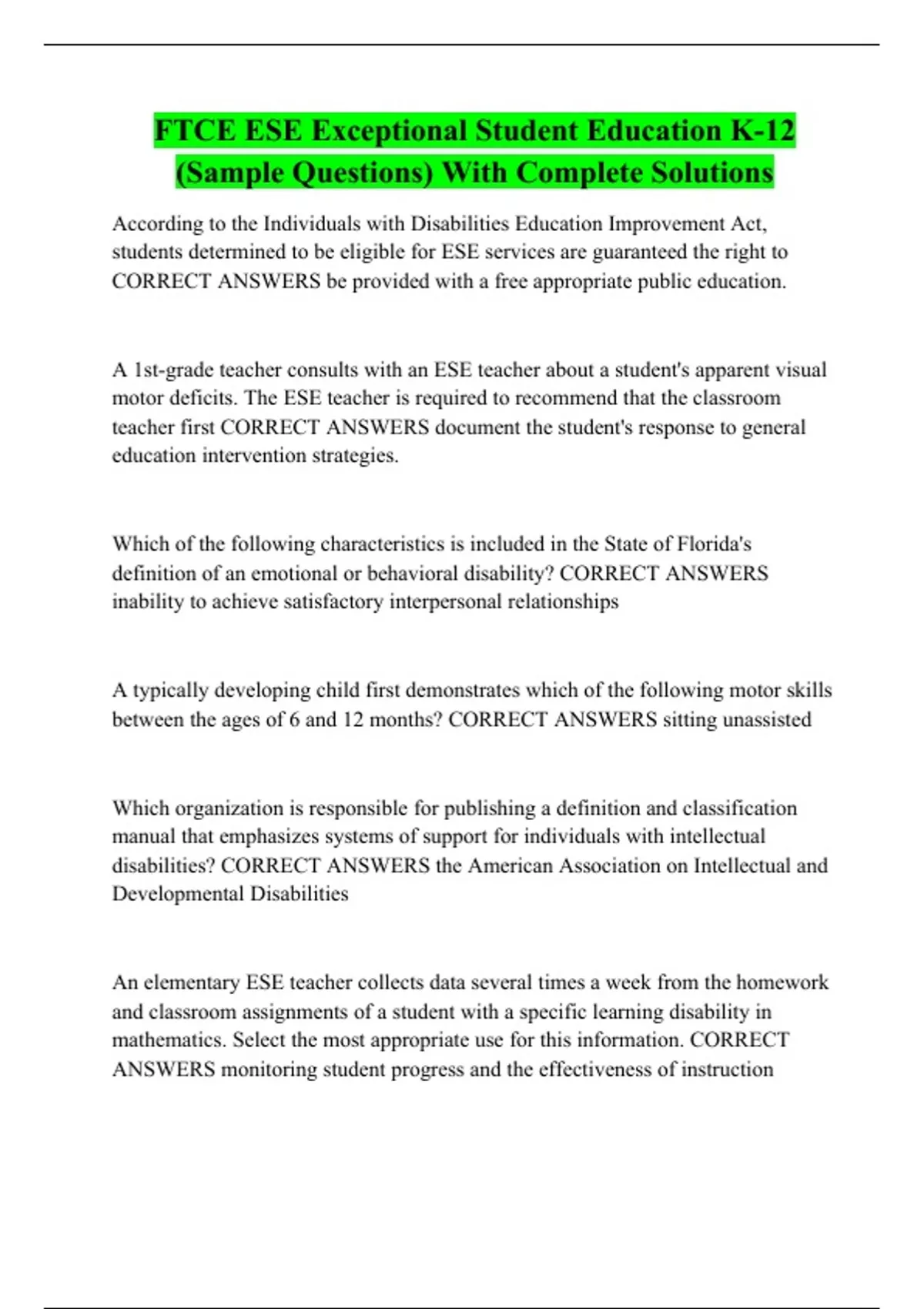 FTCE ESE Exceptional Student Education K-12 (Sample Questions) With Complete Solutions FTCE ESE Certification Practice Exam With Complete Solutions FTCE ESE Certification Test With Verified Solutions FTCE ESE Practice Test 1 Questions And Correct Answers