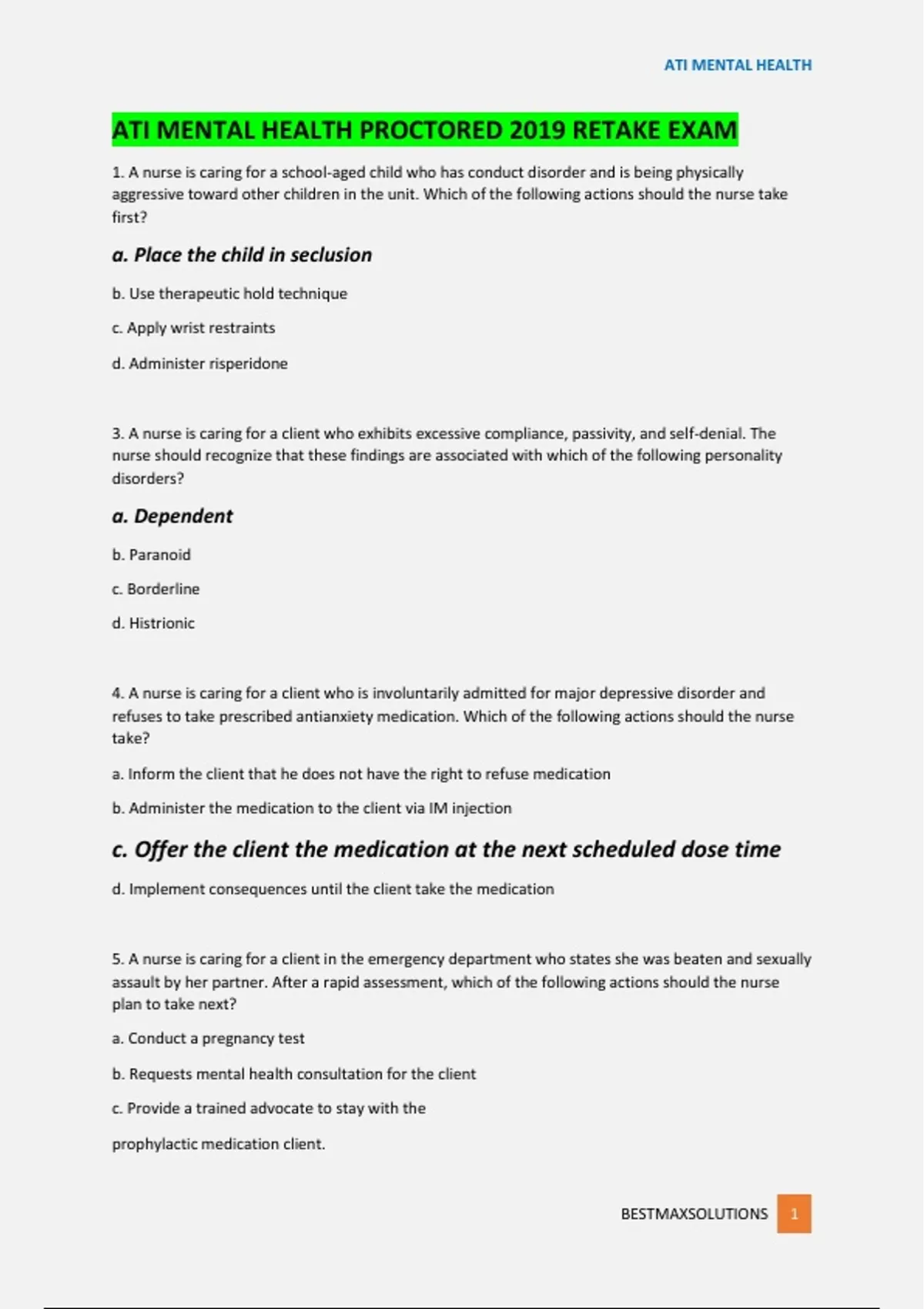 (COMPLETE) ATI MENTAL HEALTH PROCTORED EXAM V1-V12 LATEST| REAL/ACTUAL EXAMS AND ATI MENTAL HEALTH PROCTORED 2019 RETAKE EXAM: +1200 QUESTIONS ALL WITH CORRECT ANSWERS| GUARANTEE A+ SCORE GUIDE