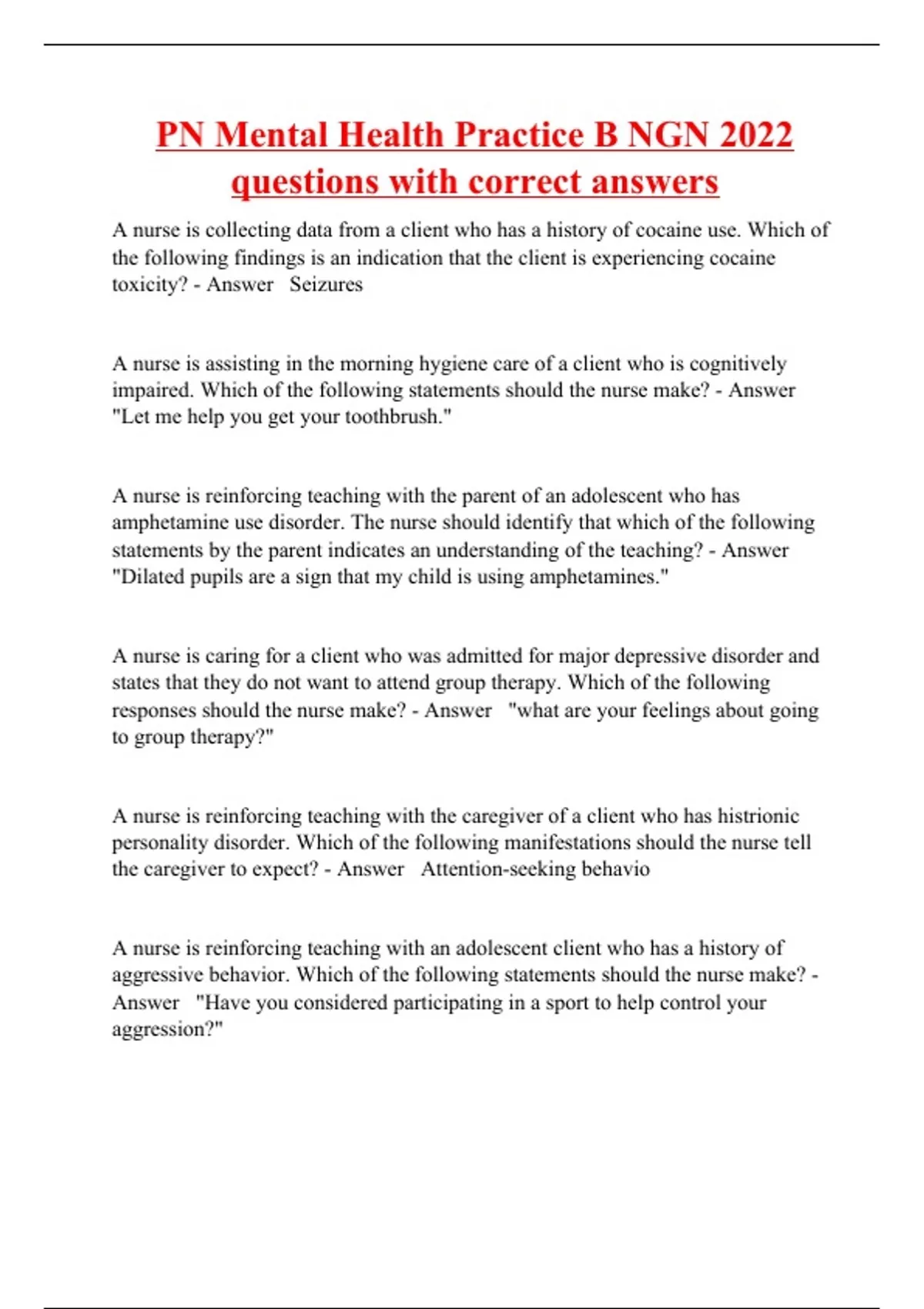 PN Mental Health Practice B NGN 2022 questions with correct answers