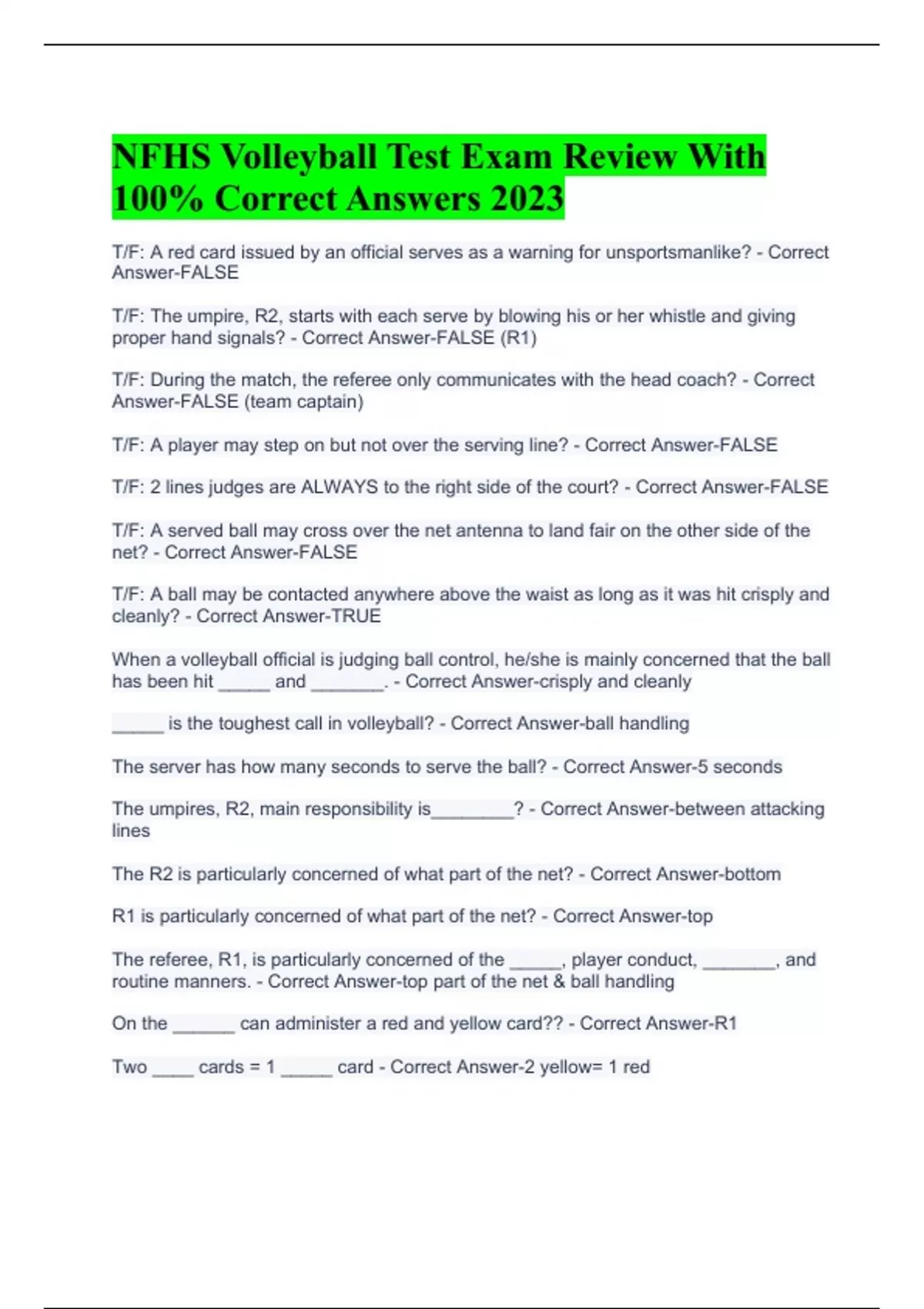NFHS Volleyball Test Exam Review With 100% Correct Answers 2023 NFHS Volleyball Exam With 100% Correct Answers 2023 NFHS Volleyball Officiating Exam With 100% Correct Answers 2023 NFHS Volleyball Test Exam With 100% Correct Answers 2023 Most Missed Volleyball Questions – Referee (Questions And Answers) Coaching Volleyball Final Exam With 100%