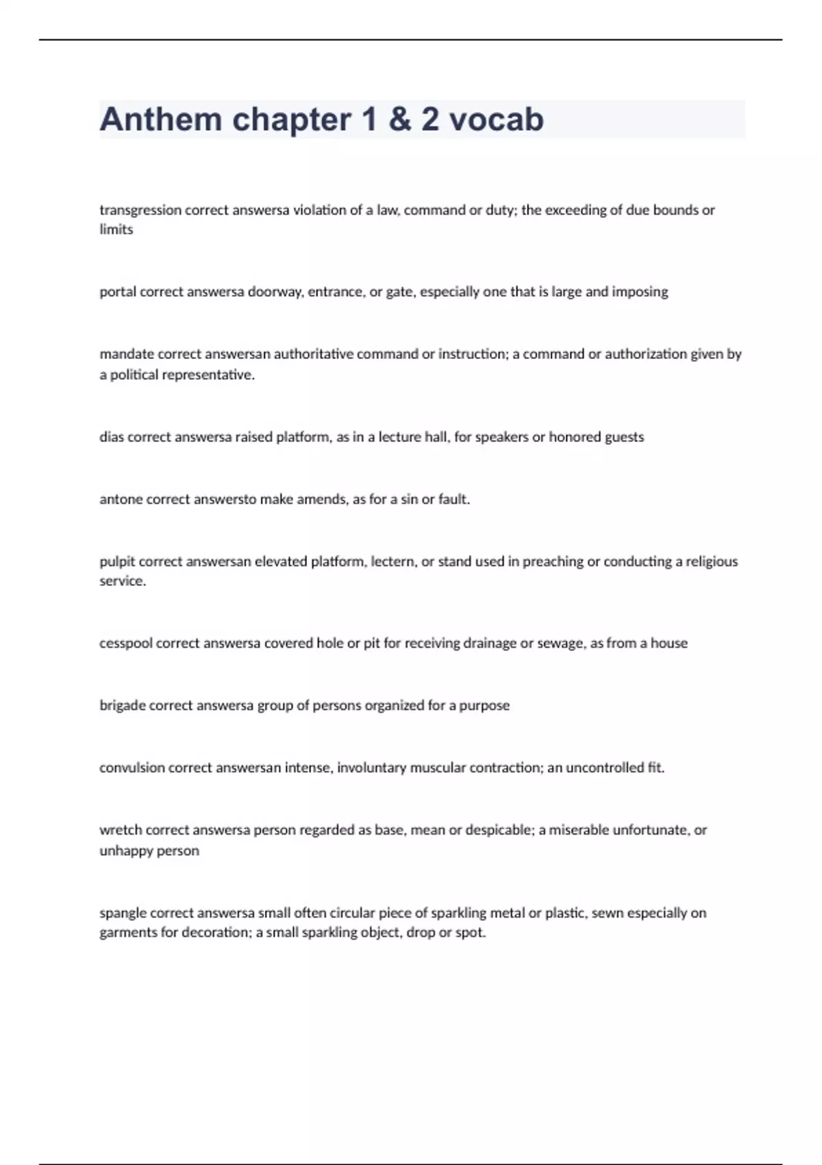 Anthem chapter 1 & 2 vocab exam with 100% correct answers