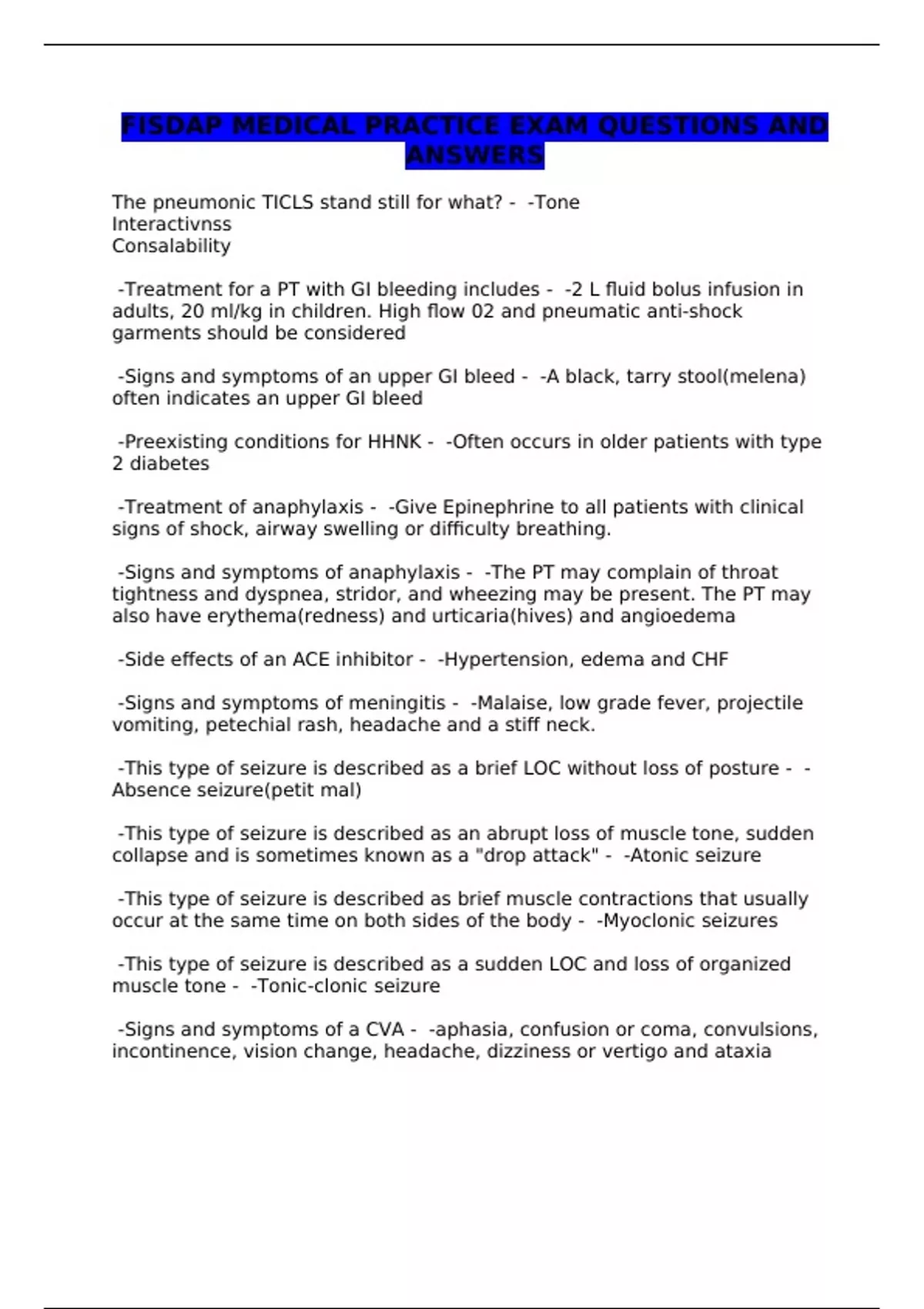 FISDAP MEDICAL PRACTICE EXAM QUESTIONS AND ANSWERS
