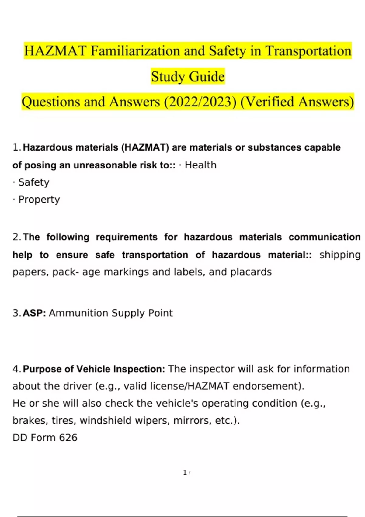 HAZMAT Familiarization and Safety In Transportation study Questions and Answers Latest [100% correct answers]