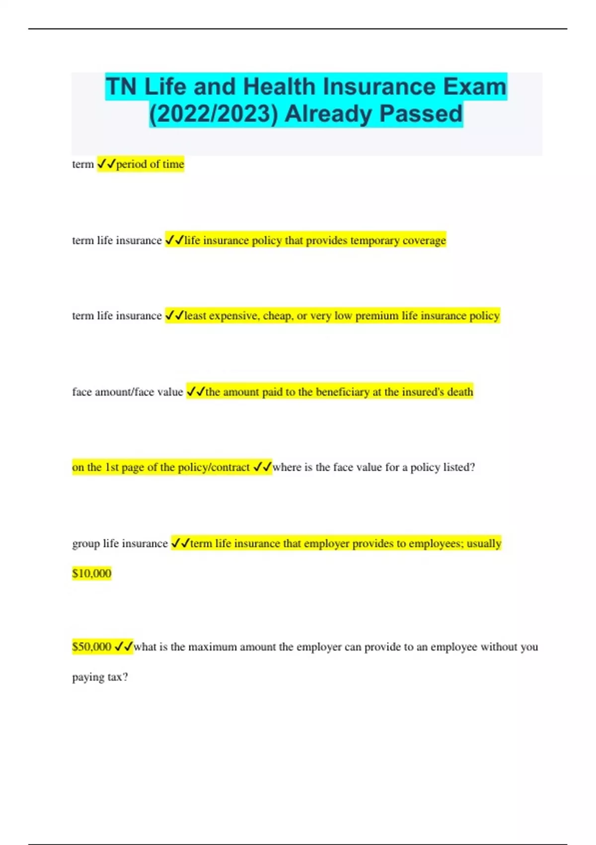 TN Life and Health Insurance Exam (2022/2023) Already Passed