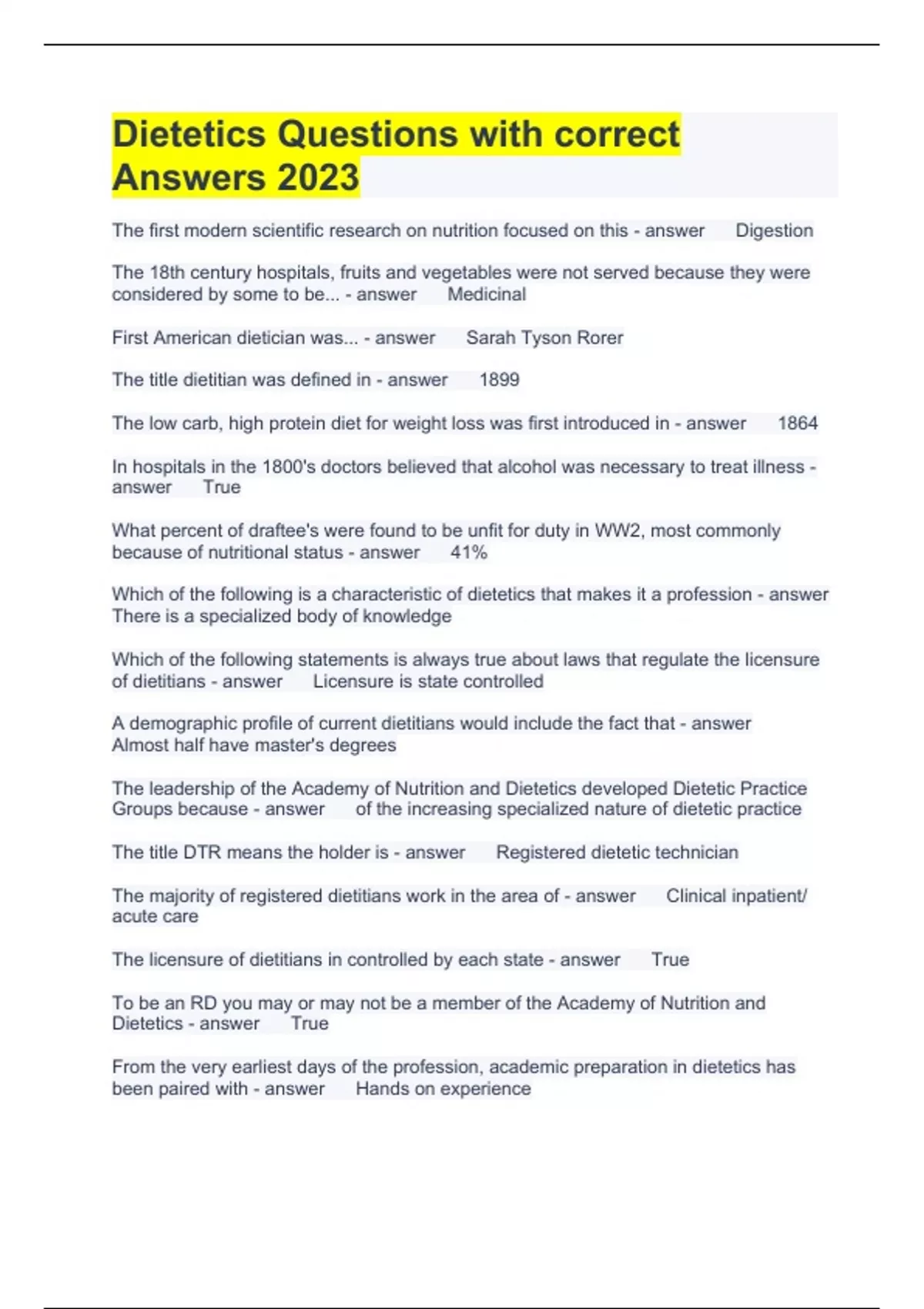 Exam (elaborations) Intro to Dietetics Questions with correct Answers 2023 Exam (elaborations) Intro to Dietetics Final Exam Questions with correct Answers 2023 Exam (elaborations) 102 clinical nutrition dietetics Questions with correct Answers 2023 Exam (elaborations) Intro to Dietetics Final Questions with correct Answers 2023 Exam (elab