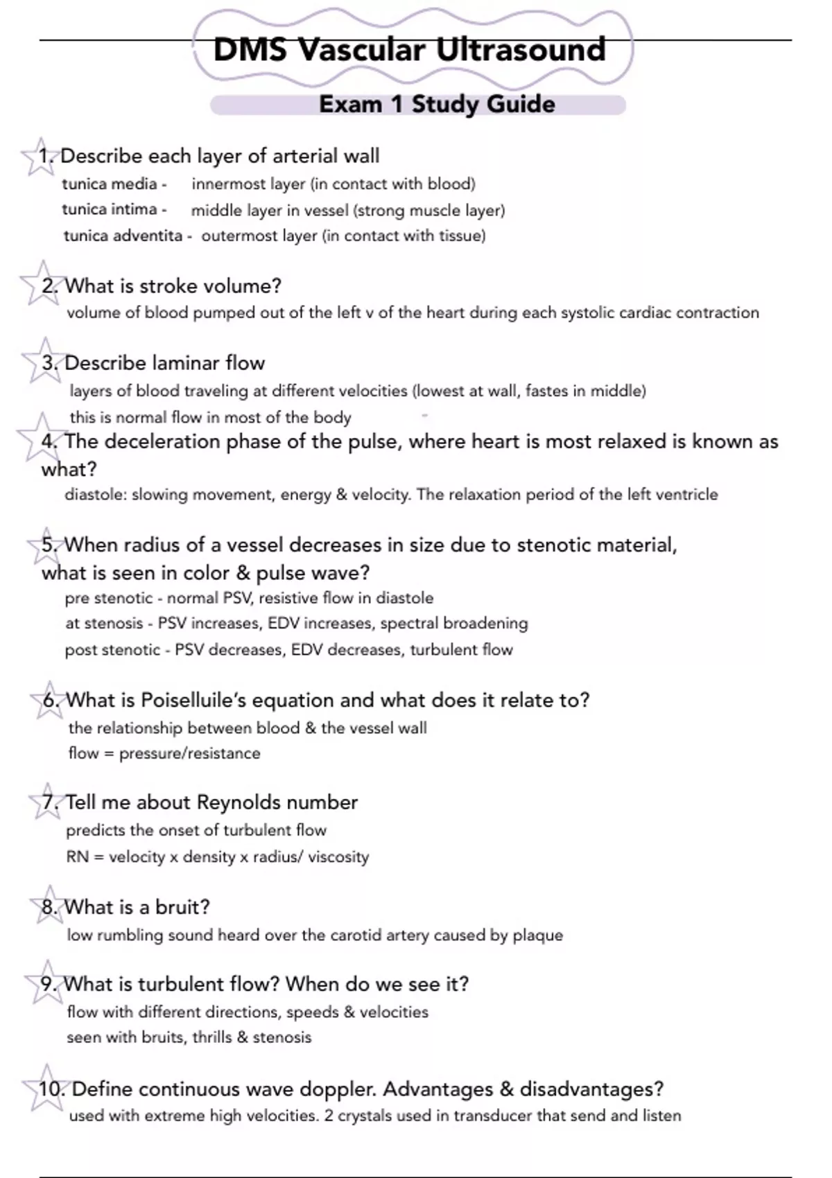 this package deal offers 3 complete study guides for exams 1-3 for peripheral vascular ultrasonography. the study guides are all color coordinated, and organized so questions and answers arent confusing. stars, highlights, bubbles and some images.