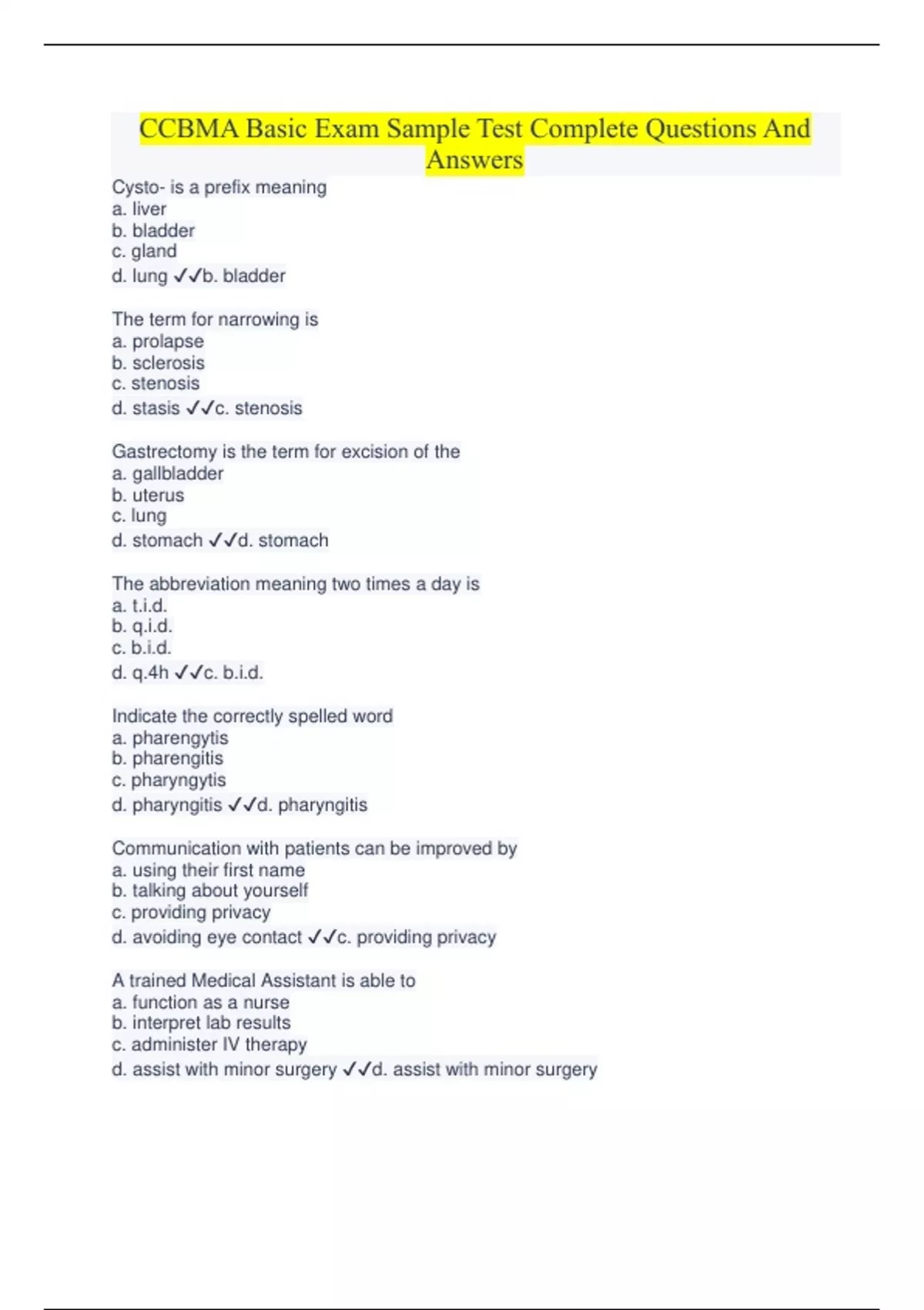 CCBMA Latest Package With Complete Solutions 2023 (all latest study guides and quiz included)