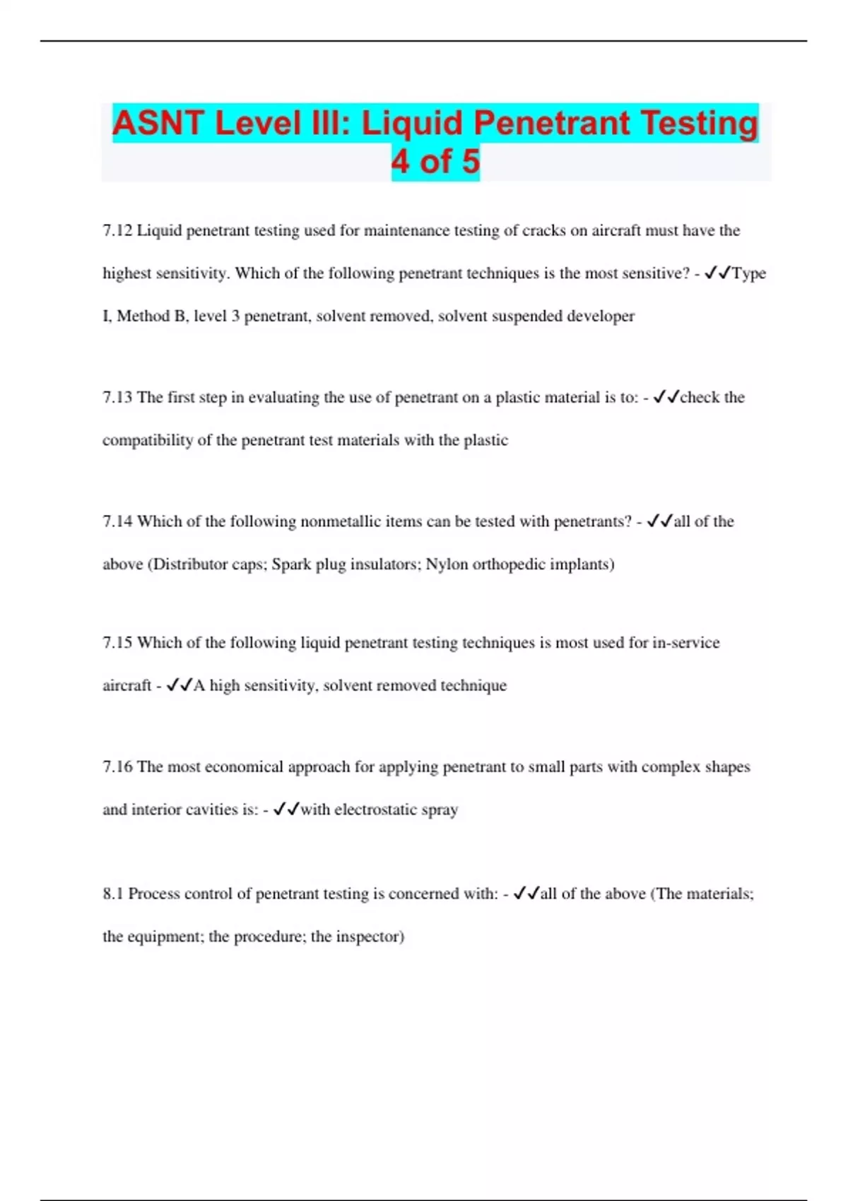 ASNT Level III: Liquid Penetrant Testing 5 of 5 | 2023 | Questions with 100% Correct Answers | Updated & Verified