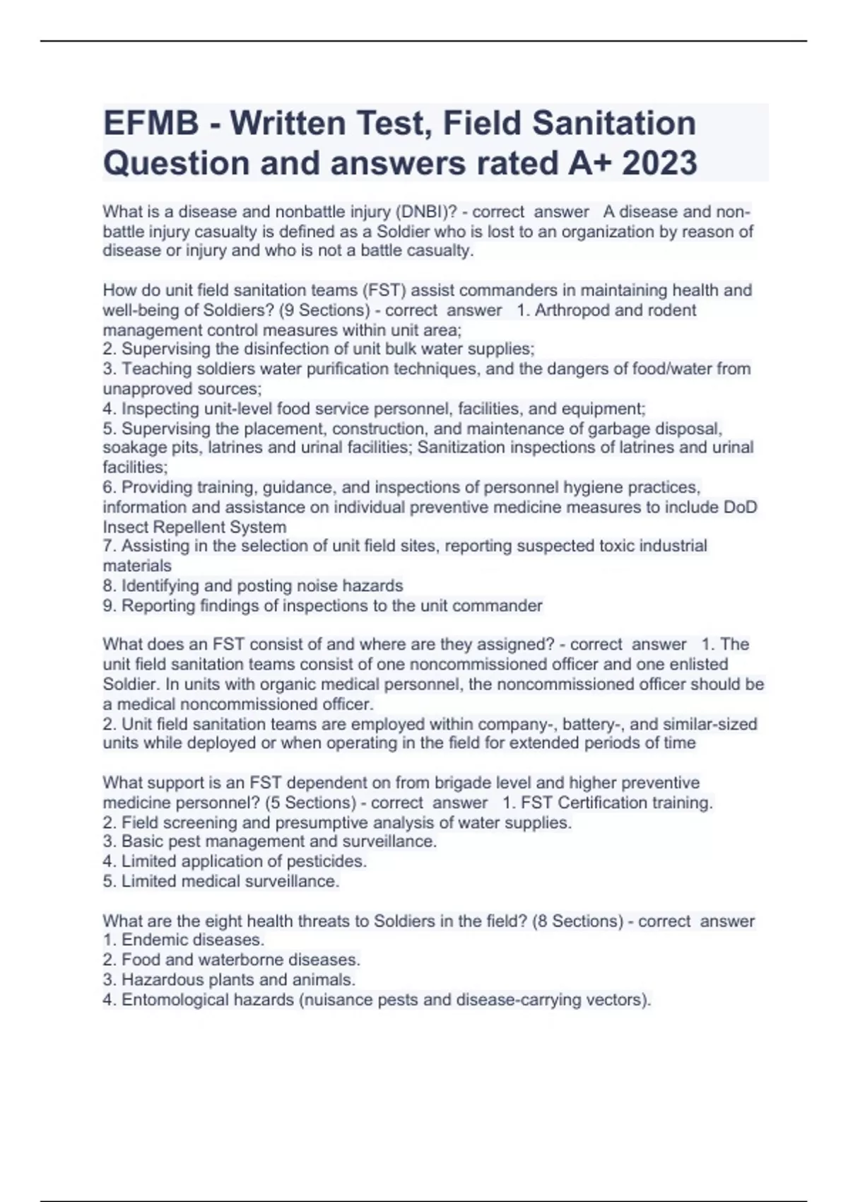 2023 EFMB Study Guide- Field San Question and answers 100% correct Exam (elaborations) Army EFMB Questions with complete solution 2023 Exam (elaborations) EFMB 2023 Pre Test Questions with complete solution Exam (elaborations) EFMB 2023 Study Guide Question and answers rated A Exam (elaborations) EFMB 2023 Study Guide Questions with complet