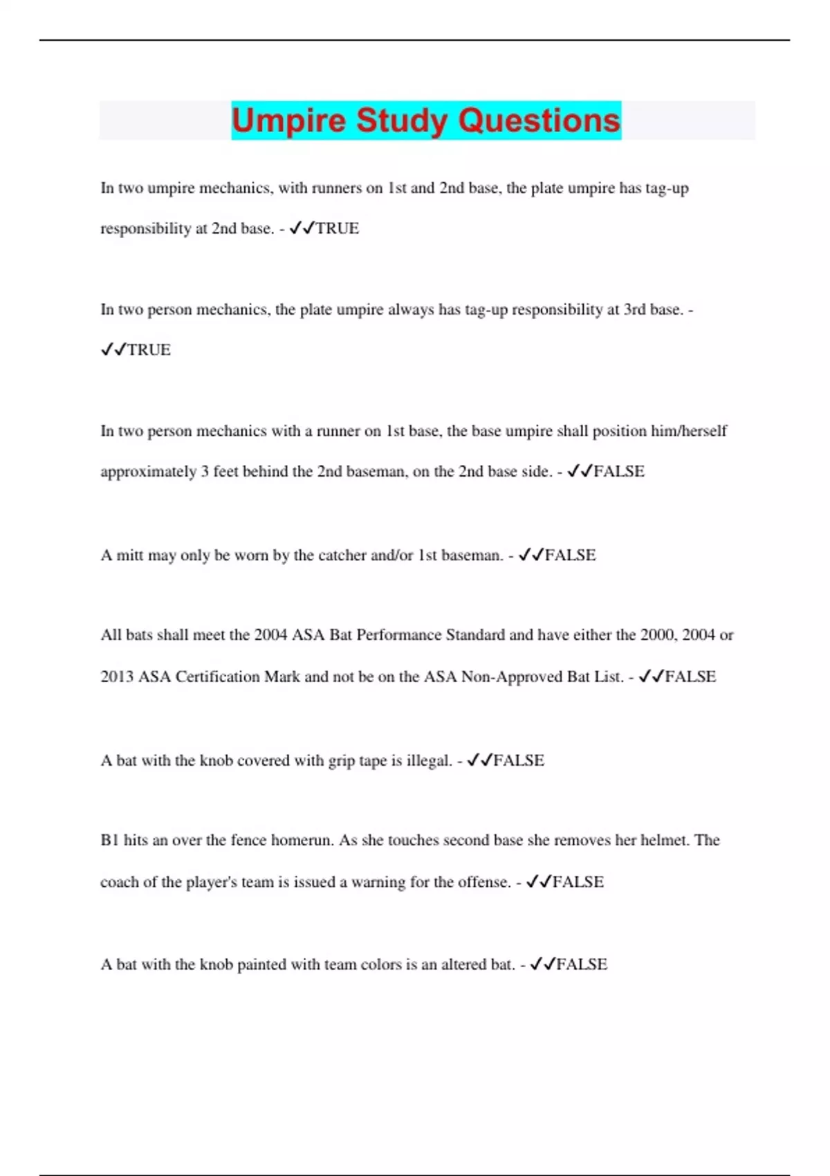 Umpire Study Questions | 75 Questions with 100% Correct Answers | Updated & Verified 2023