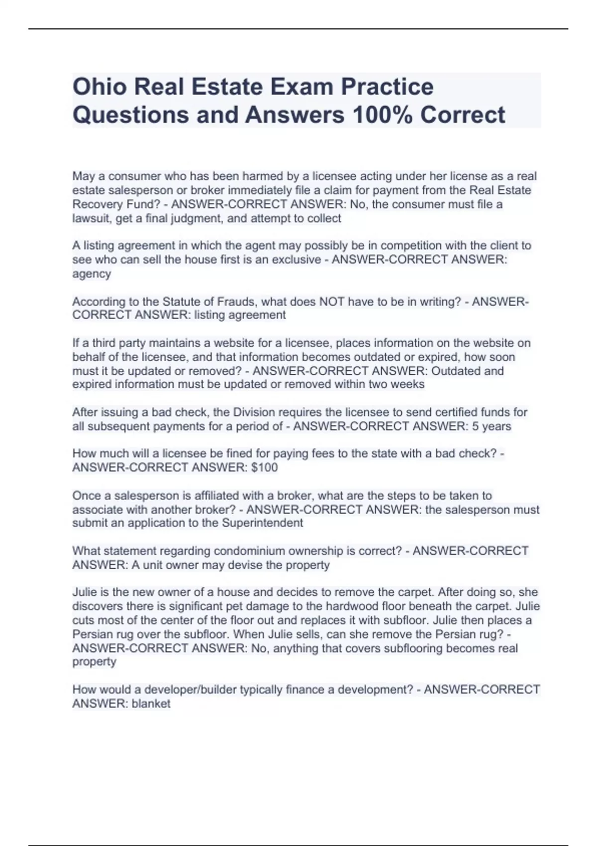 Ohio Real Estate Exam Practice Questions and Answers 100% Correct