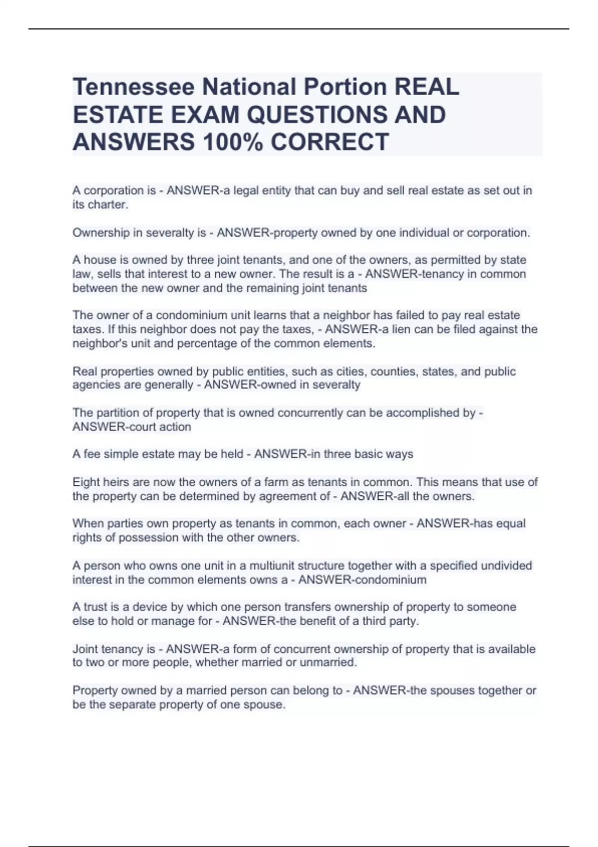 Tennessee REAL ESTATE EXAM BUNDLE|2023/2024 QUESTIONS AND ANSWERS 100% CORRECTTennessee REAL ESTATE EXAM BUNDLE|2023/2024 QUESTIONS AND ANSWERS 100% CORRECTTennessee REAL ESTATE EXAM BUNDLE|2023/2024 QUESTIONS AND ANSWERS 100% CORRECTTennessee REAL ESTATE EXAM BUNDLE|2023/2024 QUESTIONS AND ANSWERS 100% CORRECTTennessee REAL ESTATE EXAM BUNDLE|2023