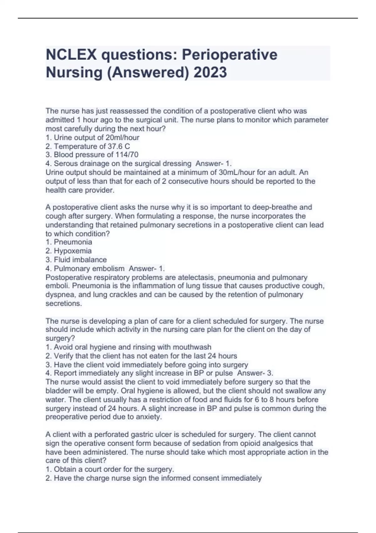 NCLEX questions: Perioperative Nursing (Answered) 2023,Ch. 30 Perioperative Nursing NCLEX Questions With 100% Correct Answers.,perioperative nursing nclex questions with solved 100% correct!!,Exam II - Chapter 21 - Perioperative Nursing, NCLEX -style questions and answers graded A+,Perioperative NCLEX questions and answers Solved Perfectly!!,Perio