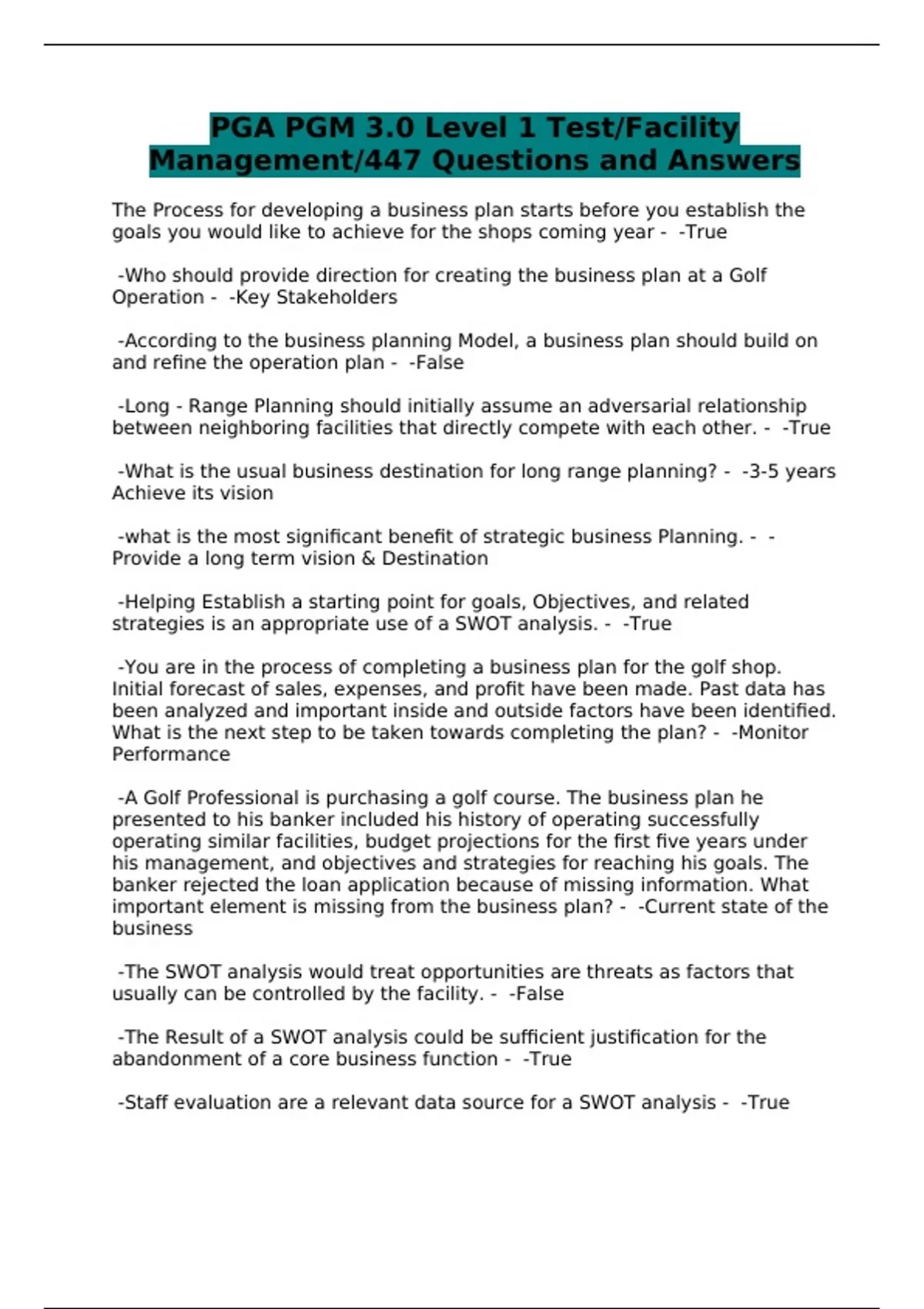 PGA PGM 3.0 Level 1 Test/Facility Management/447 Questions and Answers
