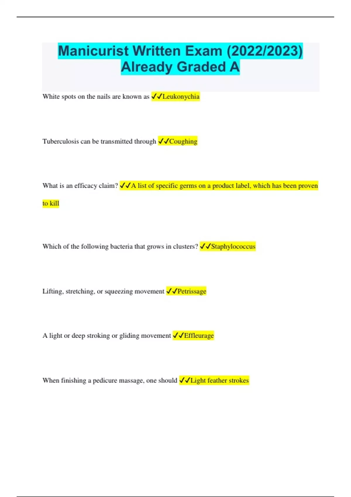 Manicurist Bundled Exams Questions and Answers with Certified Solutions