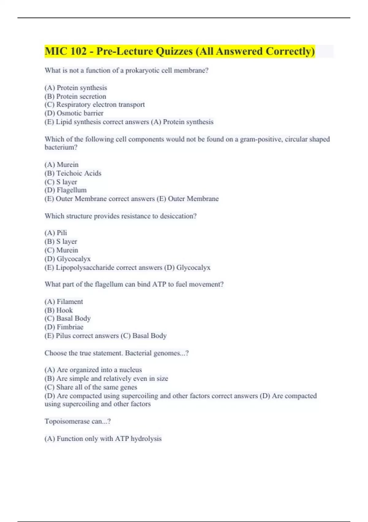 MIC 102 - Pre-Lecture Quizzes (All Answered Correctly) MIC 102 Exam 1 Pre Lecture Questions (A+ Graded) MIC 102 Exam 1 (with Complete Solutions) Mic 102 - Quizzes/Clickr (All Correct) MIC 102 UC Davis (100% Correct Answers)