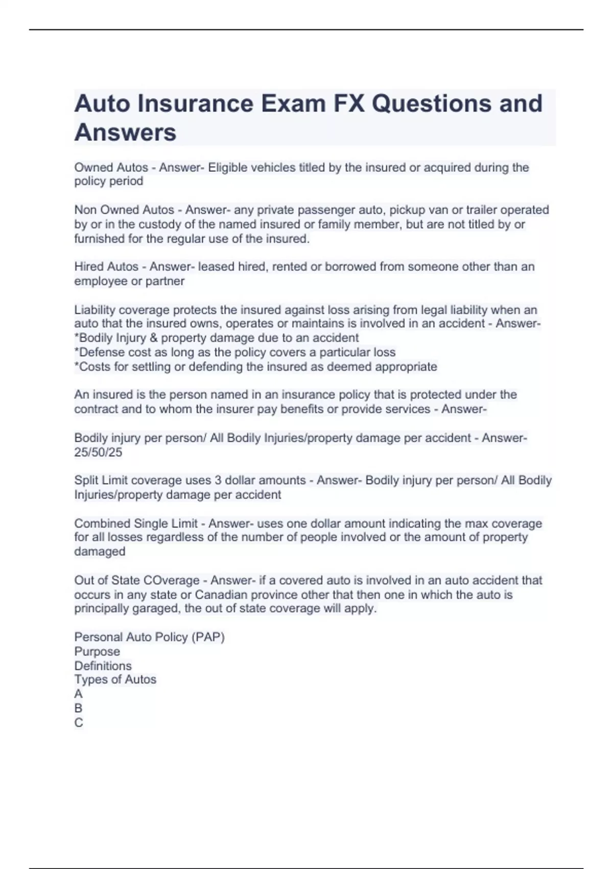 Auto Insurance Exam FX Questions and Answers Fx Casualty Exam 2023 with complete solutions Chapter 12- EXAM FX Questions with correct Answers Fx Exam 2023 Questions and Answers Life Insurance Policies Exam FX Questions and Answers Insurance Exam FX Questions and Answers Fx-Property and Casualty FX REVIEW EXAM 2023 QUESTIONS AND ANSWERS