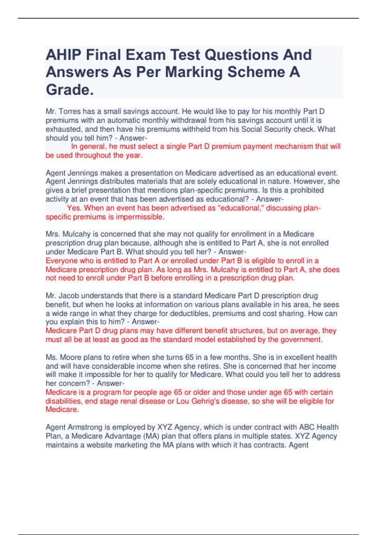 AHIP FINAL EXAM REAL QUESTION AND ANSWERS WITH EXPALANTION GRADED AS PER MARKING SCHEME.